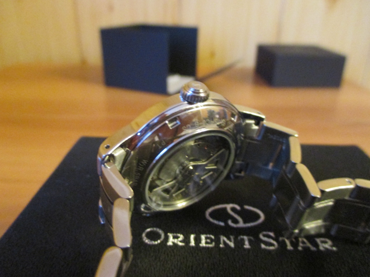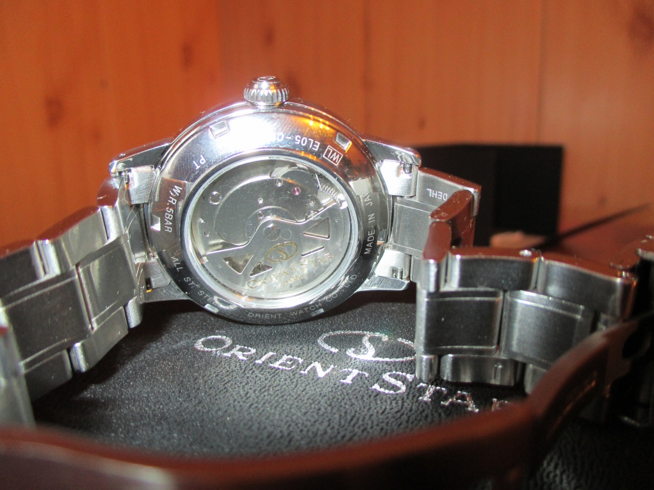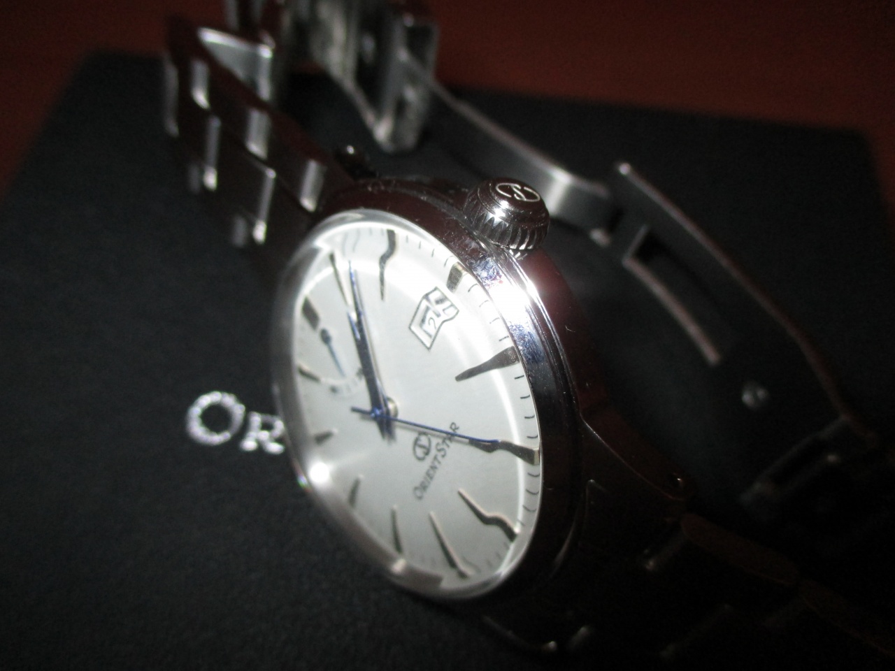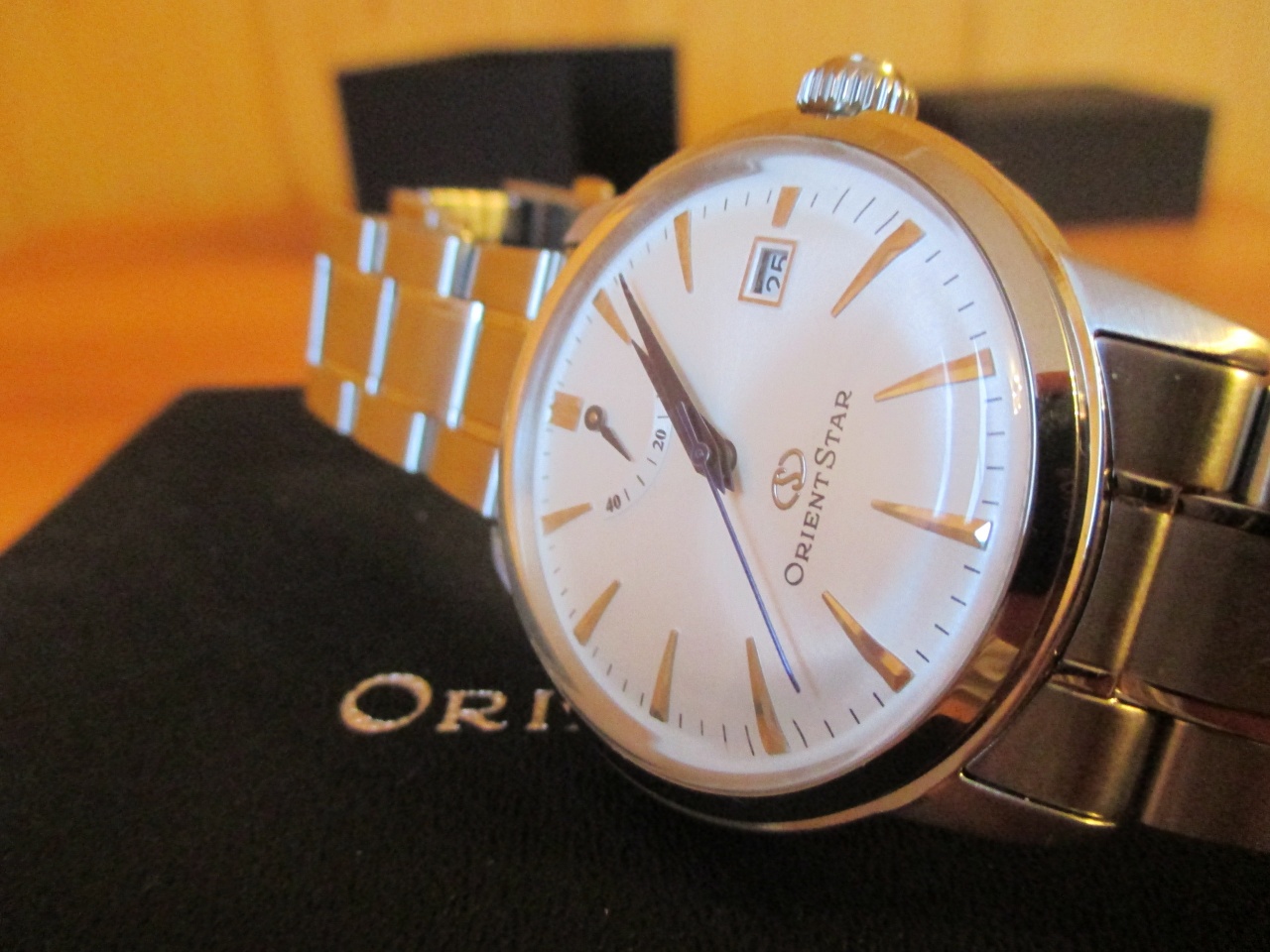 Вот опять часовая болезнь обострилась, теперь у меня живёт новый ориент:D Реф EL05003W Изначально хотел приобрести какой нибудь кварц, но слишком мне эти часики приглянулись. И вроде совсем простые, но воистину классика. Белый цифер с почти незаметными лучами из центра, синие стрелки в зависимости от освещения играющие от синевы до черноты. Дата тоже нормально что есть. Запас хода- отлично. Браслет сначала укоротил на звено, потом поставил обратно, укоротив длину переставив шпильку в пряжке. Удобно, не броско. wr 50 -для таких часиков самое оно, даже плавать можно. Отсутствие люма тоже не напрягло. Очень читаемый светлый циферблат с тёмными стрелами видно и в темноте. Порой люм под рукавом не заряжается и в нужный момент не светит. Тут этой проблемы просто нет. Уже проверил точность. Вроде всё хорошо. Вначале показалось что идут весьма вперёд, но по истечению суток наверно секунд на 5-10 всего спешат. Ещё там интересное стекло - выпуклое как на старых костюмниках. Минералка. В общем, часики здоровские.