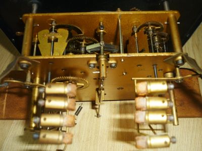 Вложение 855696 но у них бой такой легкий, непринужденный, только часы отбивают мощно а вот к немецким четвертным не могу привыкнуть, т.к. они каждую ноту выцеживают не спеша и основательно с Perivale - та же история, хочу уменьшить громкость боя, уменьшив угол подъема молоточков, придется с демпферами поколдовать, подняв их выше в этих Vedette есть т.н. silencers - рычаги, которые поднимают молоточки, не блокируя при этом работу механизмов боя активируются с помощью двух цепочек по бокам - на конце каждой цепочки есть колечко, для которого предназначен крючок на боковой стенке корпуса можно отключить молоточки как обоих боев, так и каждого в отдельности |