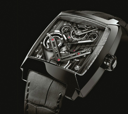 Самая близкая к автоспорту часовая мануфактура TAG Heuer в 2004 году презентовала уникальный концепт Monaco V4 с ременным приводом вместо хрестоматийной шестеренчатой передачи. Пять лет спустя швейцарцы запустили его в серию, а теперь и вовсе оснастили «четверку» уникальным турбийоном