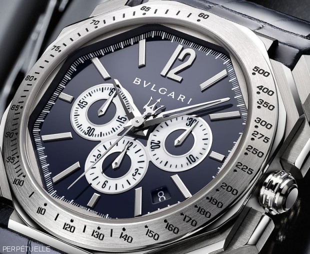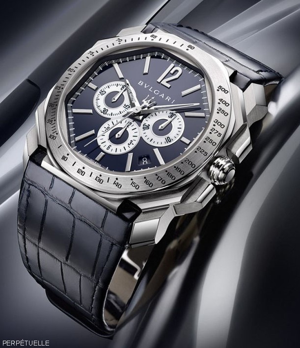 Корпус новинки выполненный в октогональной форме, изготовленный из нержавеющей стали, диаметром 41,5 мм. На фиксированном стальном безеле выгравирована круглая тахиметрическая шкала. Шаровидная заводная головка расположена на 3 часах, пушеры хронографа - на 2 и 4 часах. Сапфировое стекло установлено на передней стороне часового корпуса и на его завинчивающейся задней крышке (с синим тонированием, надписью "Maserati" и с изображением эмблемы этого бренда). Циферблат синего цвета, с накладными стальными арабскими цифрами, часовыми индексами и стрелками (в том числе часовая и минутная стрелки - скелетонизированные, а на противовесе центральной секундной стрелки - объемное изображение трезубца - эмблемы бренда Maserati). Модель оснащена швейцарским автоматическим механизмом Bvlgari Velocissimo BVL 328 (базовый калибр El Primero от Zenith), с балансовой частотой 36000 полуколебаний в час (5 гц), с фуекциями индикации часов, минут (посредством соответствующих центральных стрелок), секунд (на малом боковом циферблате, расположенном на 9 часах), даты (посредством соответствующего цифрового указателя в апертуре, расположенной между 4 и 5 часами), а также с хронографом (центральная секундная стрелка, круглый аналоговый 30-минутный счетчик, расположенный на 3 часах и круглый аналоговый 12-часовый счетчик, расположенный на 6 часах). Поставляется на синем ремешке из кожи аллигатора с застежкой из нержавеющей стали. Лимитированный выпуск 1914 экземпляров (год основания Maserati). Цена модели составляет 9700 евро. Вложение 862103 Вложение 862105 Вложение 862106 Источник: http://blog.perpetuelle.com/watches/...n-chronograph/ |