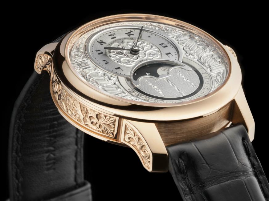 Новая уникальная модель Decalogue Luah Shana от российского часового производителя Konstantin Chaykin имеет круглый полированный корпус с великолепной ручной резьбой на его боковой поверхности и на ушках, изготовленный из 18-каратного розового золота, диаметром 42,0 мм. На торцн рифленой заводной головки, расположенной на 3 часах, выгравирована эмблема бренда Konstantin Chaykin. Сапфировое стекло установлено на передней стороне часового корпуса и на его задней крышке. Циферблат выполнен из родированной позолоченной меди, декорирован ручной гравировкой, диаметром 36,7 мм, с черными стрелками на децентрализованном малом боковом циферблате, расположенном на 12 часах и размеченном, вместо цифр, буквами иврита.