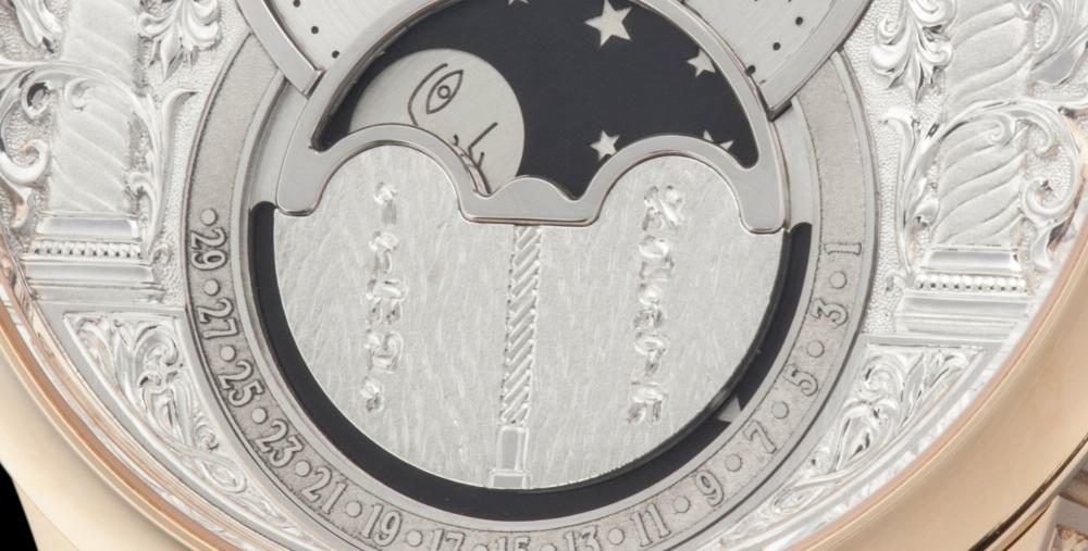 Модель оснащена мануфактурным российским механизмом с ручным заводом Konstantin Chaykin K01-0, изготовленным из золота, с якорным спуском, на 17 камнях, 48-часовым запасом хода, функциями индикации часов, минут (посредством соответствующих центральных стрелок, движущихся справа налево - "против хода часовой стрелки"), фаз Луны, запаса хода и с лунным календарем. Калибр отменно отделан и декорирован.