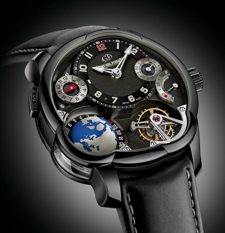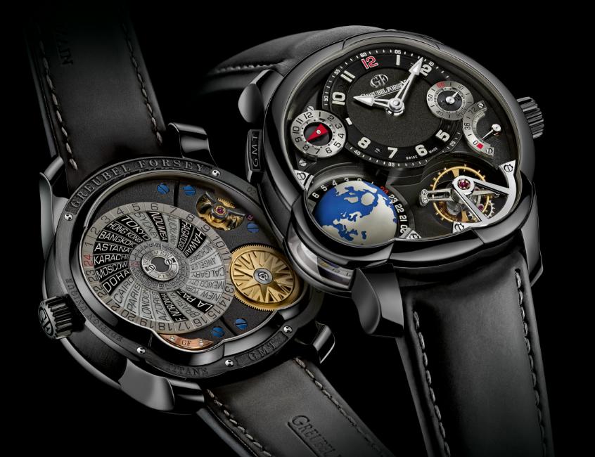 Новая модель GMT Black от швейцарской часовой компании GREUBEL FORSEY, как это и следует из ее наименования, отличается фирменным асимметричным корпусом, изготовленным из титана с черным ADLC-покрытием. Его диаметр составляет 43,5 мм, толщина - 16,1 мм, он водонепроницаемый до 30 метров. На торце рифленой заводной головки, расположенной на 3 часах, выгравирован логотип бренда Greubel Forsey. На 10 часах расположена прямоугольная кнопка с выгравированной надписью "GMT". Сапфировое стекло установлено на лицевой стороне корпуса (выпуклое, асимметричное) и на его задней крышке. На боковой поверхности корпуса на 8 часах имеется окошко, прикрытое сапфировым стеклом, через которое просматривается экватор вращающейся модели земного шара. Циферблат сложный многоуровневый, черного цвета, с серебристыми стрелками. Стрелка второго часового пояса выполнен в виде красного треугольника.