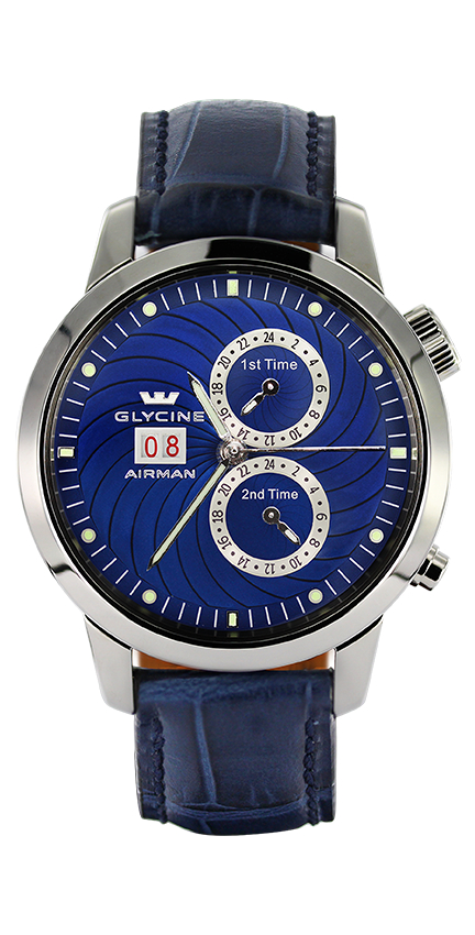 Новая модель Airman Seven (Ref. 3919) от швейцарской часовой компании Glycine позиционируется производителем в качестве часов, предназначенных для владельцев, которые часто путешествуют по миру. Она представлена в двух версиях: с циферблатом синего цвета, на синем кожаном ремешке и с циферблатом черного цвета на черном кожаном ремешке.