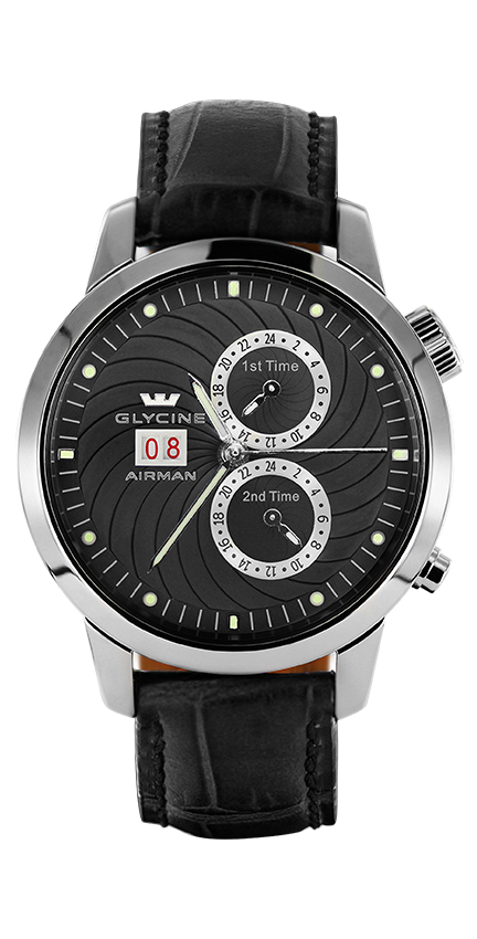 Круглый полированный корпус новинки, изготовленный из нержавеющей стали, диаметром 46,00 мм, толщиной 13,87 мм, водонепроницаемый до 200 метров. На торце завинчивающейся рифленой заводной головки, расположенной на 2 часах, выгравирована эмблема бренда Glycine. Сапфировое стекло установлено на передней стороне часового корпуса (с двусторонним антибликовым покрытием) и на его завинчивающейся задней крышке. Циферблат отделанный вихреобразным гильошированием, с накладными часовыми индексами, покрытыми, как часовая и минутная стрелки, люминесцентным составом светло-зеленого цвета. Модель оснащена швейцарским автоматическим механизмом Glycine GL230, на 25 камнях, с балансовой частотой 28800 полуколебаний в час (4 гц), 38-часовым запасом хода, с функциями индикации часов, минут, секунд (посредством соответствующих центральных стрелок), даты (посредством соответствующего цифрового указателя в большой сдвоенной апертуре, расположенной на 9 часах), а также времени второго и третьего часового поясов (на соответствующих малых боковых циферблатах с 24-часовой разметкой, расположенных на 13 и 5 часах и управляемых посредством нажатий соответственно на заводную головку и на пушер, расположенный на 4 часах). Поставляется на кожаном ремешке с застежкой из нержавеющей стали. Источник: http://www.glycine-watch.ch/e/collec...isplay=10004F# |