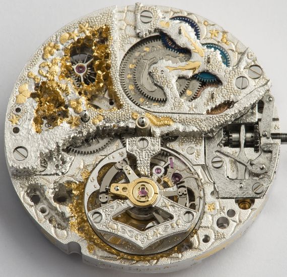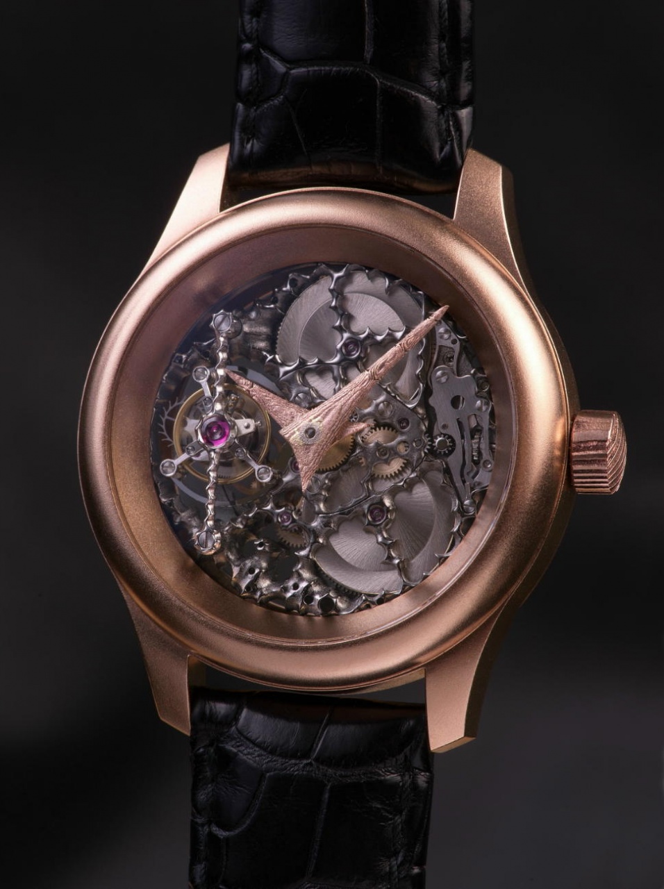 Вложений: 2 Новая модель Tourbillon Organic Skeleton от Kees Engelbarts (основатель одноименного бренда является выдающимся голландским мастером-гравером, известным своими художественными циферблатами, используемыми в моделях ряда люксовых часовых компаний) имеет круглый корпус, изготовленный из 18-каратного розового золота, диаметром 43,0 мм. Рифленая травленная золотая заводная головка расположена на 3 часах. Сапфировое стекло, с двусторонним антибликовым покрытием, установлено на лицевой стороне корпуса и на его завинчивающейся задней крышке. Циферблат вручную скелетонизированный и гравированный, выполнен из протравленного розового золота. Стрелки также золотые, протравленные.