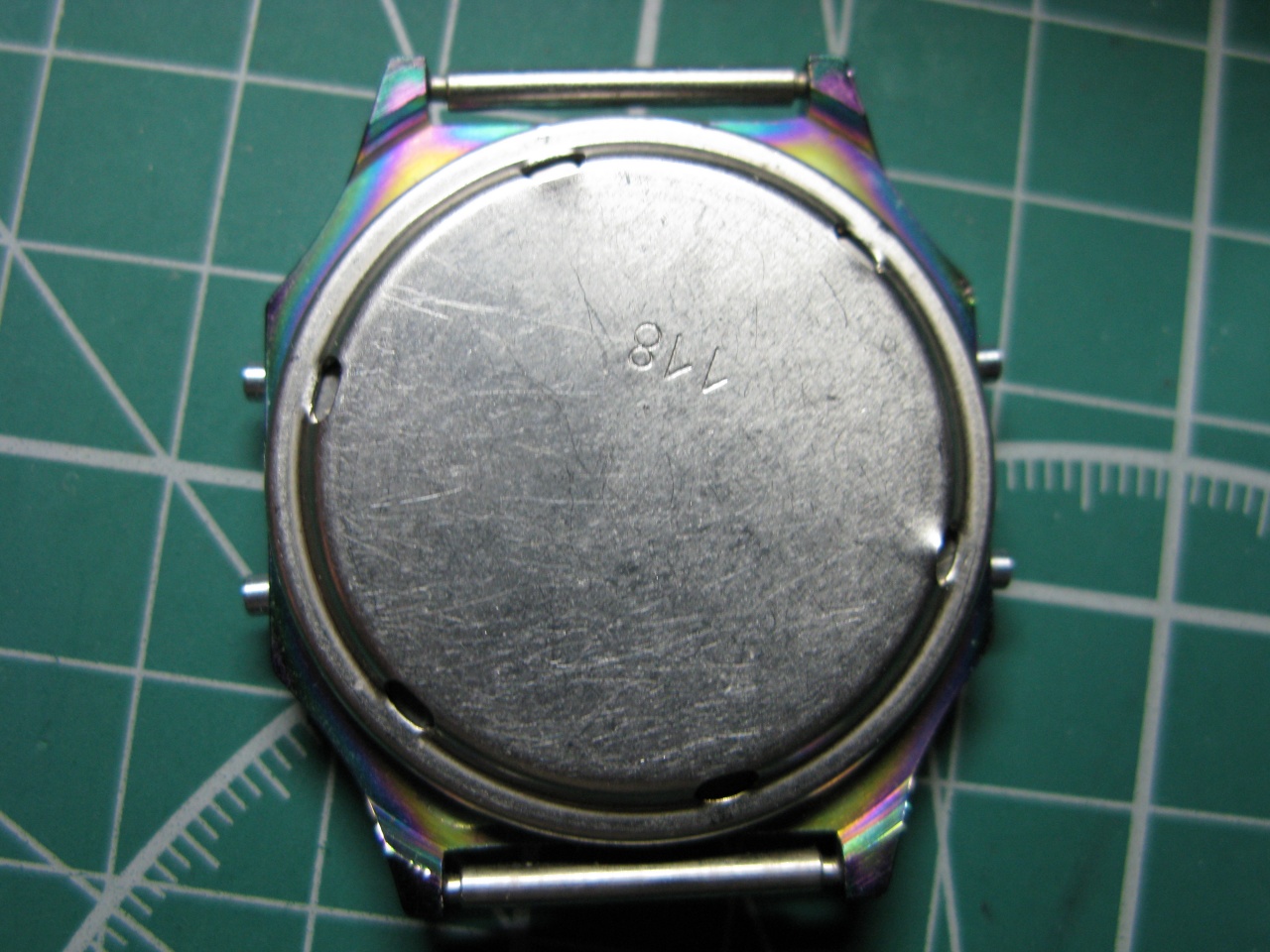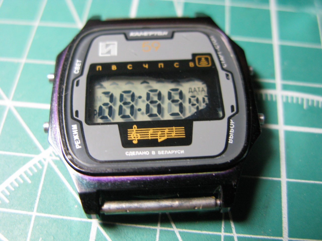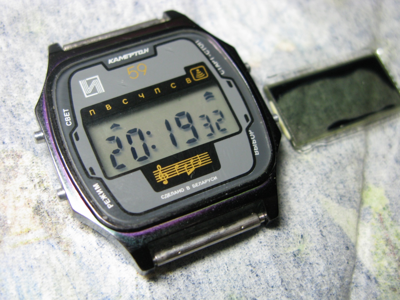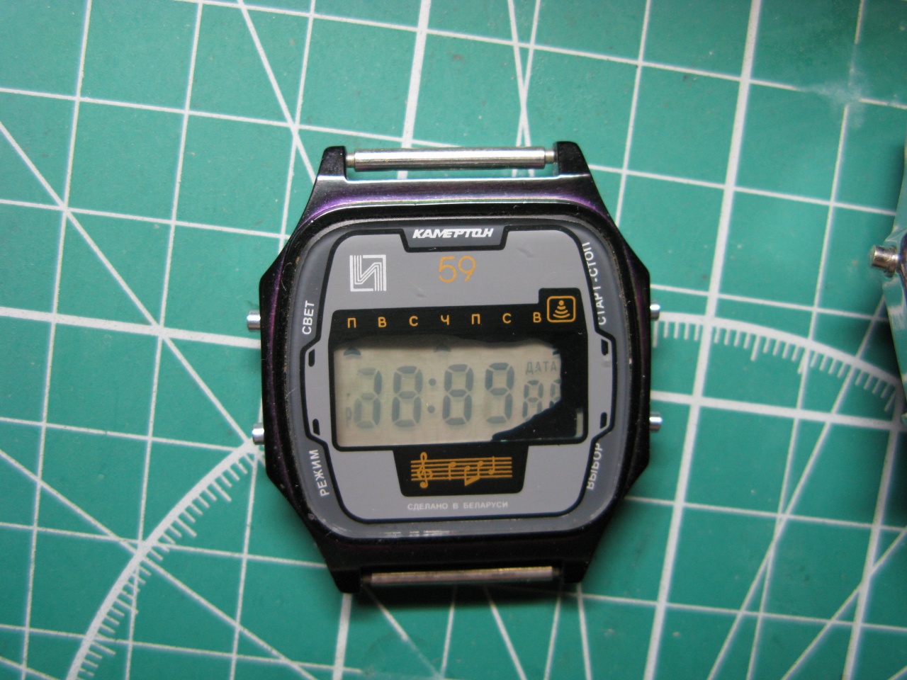 Ну а с Камертоном всё намного сложнее. Надо отметить, что корпус у этого Камертона необычный. Не по форме нет. Знаю, корпуса в хроме, в позолоте, чернённые, в оксиде титана наконец, или просто нержавейка. Этот...., даже не знаю как это обозвать. Он "обожжённый" или "перегретый", "синяя" побежалость на основных поверхностях. И это довольно органично согласуется с основным цветом стекломаски. А вот дисплей потёкший. От какой Электроники можно взять аналог? Ну и при установке батарейки на дисплее отобразилась полнейшая каша. Под одним углом видны все элементы дисплея, под другим ни чего почти не видно.