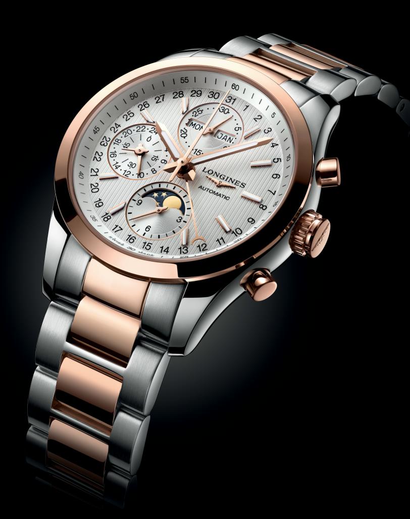 Полированный круглый корпус новинки изготовлен из нержавеющей стали, или из нержавеющей стали и 18-каратного розового золота, или из 18-каратного розового золота, диаметром 42,0 мм, водонепроницаемый до 50 метров. На торце рифленой заводной головки, расположенной на 3 часах, выгравирована эмблема бренда Longines. Пушеры хронографа размещены на 2 и 4 часах. Сапфировое стекло установлено на передней стороне корпуса (с антибликовым покрытием) и на его завинчивающейся задней крышке. Циферблат черного или серебристого цвета, с вертикальной отделкой, с родированными или золотыми накладными часовыми индексами, покрытыми, как и часовая и минутная стрелки, белым люминесцентным составом SuperLumiNova. На фланце циферблата нанесена круглая минутная шкала.