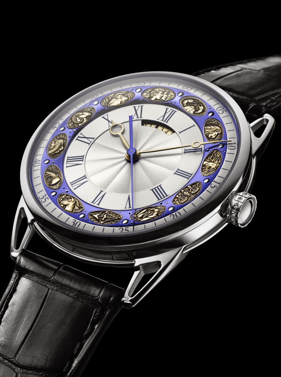 Новая лимитированная модель DB25T Zodiac (Ref. DB25TWS3V3) от швейцарской часовой компании De Bethune имеет полированный круглый корпус, изготовленный из 18-каратного белого золота, диаметром 44,0 мм, толщиной 10,6 мм. Заводная головка расположена на 3 часах. Ушки "выдолбленные". Сапфировое стекло установлено на лицевой стороне часового корпуса (с двусторонним антибликовым покрытием) и на его задней крышке. Циферблат, серебристого цвета с лучистой отделкой, черными римскими цифрами, золотыми вручную гравированными изображениями двенадцати знаков зодиака (работы художника Michèle Rothen). Часовая и минутная стрелки выполнены из желтого золота с "яблоками Бреге", секундная - вороненая.