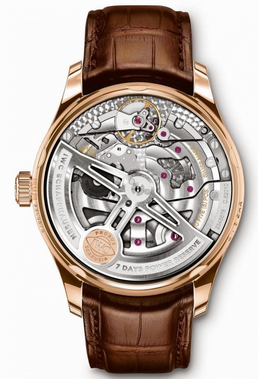 Ref. IW500701 (корпус из 18-каратного розового золота, циферблат серебристого цвета, золотыми часовыми индексами и стрелками, темно-коричневый ремешок из кожи аллигатора); Ref. IW500702 (корпус из 18-каратного розового золота, циферблат сланцевого цвета, золотыми часовыми индексами и стрелками, темно-коричневый ремешок из кожи аллигатора); Ref. IW500703 (корпус из нержавеющей стали, циферблат черного цвета, серебристыми часовыми индексами и стрелками, черный ремешок из кожи аллигатора); Ref. IW500704 (корпус из нержавеющей стали, циферблат серебристого цвета, воронеными часовыми индексами и стрелками, черный ремешок из кожи аллигатора); Ref. IW500705 (корпус из нержавеющей стали, золотыми часовыми индексами и стрелками, циферблат серебристого цвета, черный ремешок из кожи аллигатора). Корпус круглый, полированный, диаметром 42,3 мм, толщиной 14,5 мм, водонепроницаемый до 30 метров. На торце рифленой заводной головки, расположенной на 3 часах, выгравировано изображение логотипа бренда IWC. Сапфировое стекло установлено на передней стороне часового корпуса (выпуклое, с двусторонним антибликовым покрытием) и на его задней крышке. Арабские цифры на циферблате накладные, часовая и минутная стрелки - листьевидной формы. Модель оснащена мануфактурным швейцарским автоматическим механизмом IWC 52010, с системой автоподзавода Pellaton, на 31 камне, с балансовой частотой 28800 полуколебаний в час (4 гц), семидневным (168 часов) запасом хода, с золотым медальоне на роторе автоподзавода, функциями индикации часов, минут (посредством соответствующих центральных стрелок), секунд (на малом боковом циферблате, расположенном на 9 часах), даты (посредством соответствующего цифрового указателя в большой апертуре, расположенной на 6 часах) и запаса хода (посредством соответствующего круглого аналогового указателя, расположенного на 3 часах). Вложение 900743Вложение 900744Вложение 900745 Вложение 900746Вложение 900747 Источник: http://www.masterhorologer.com/2015/...automatic.html |