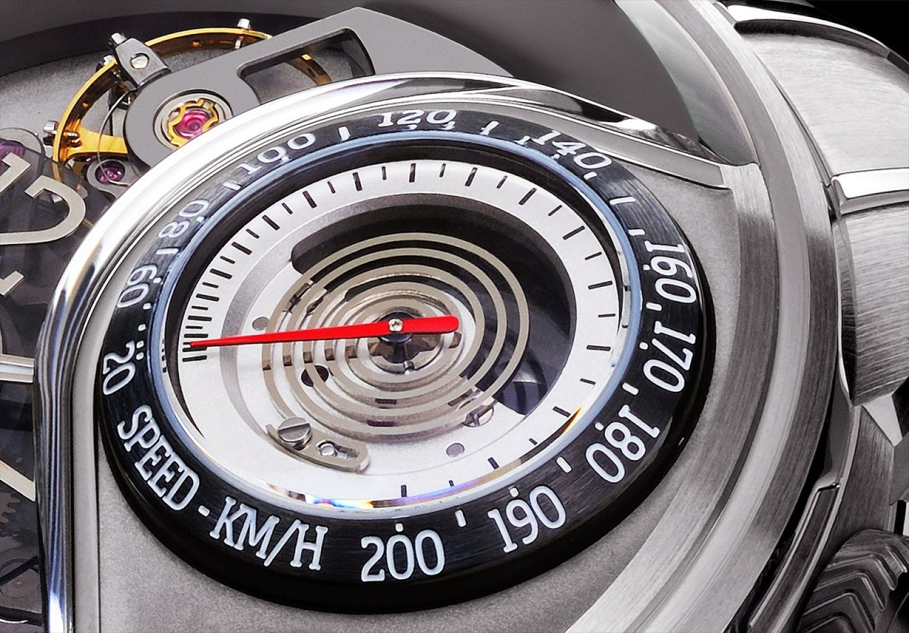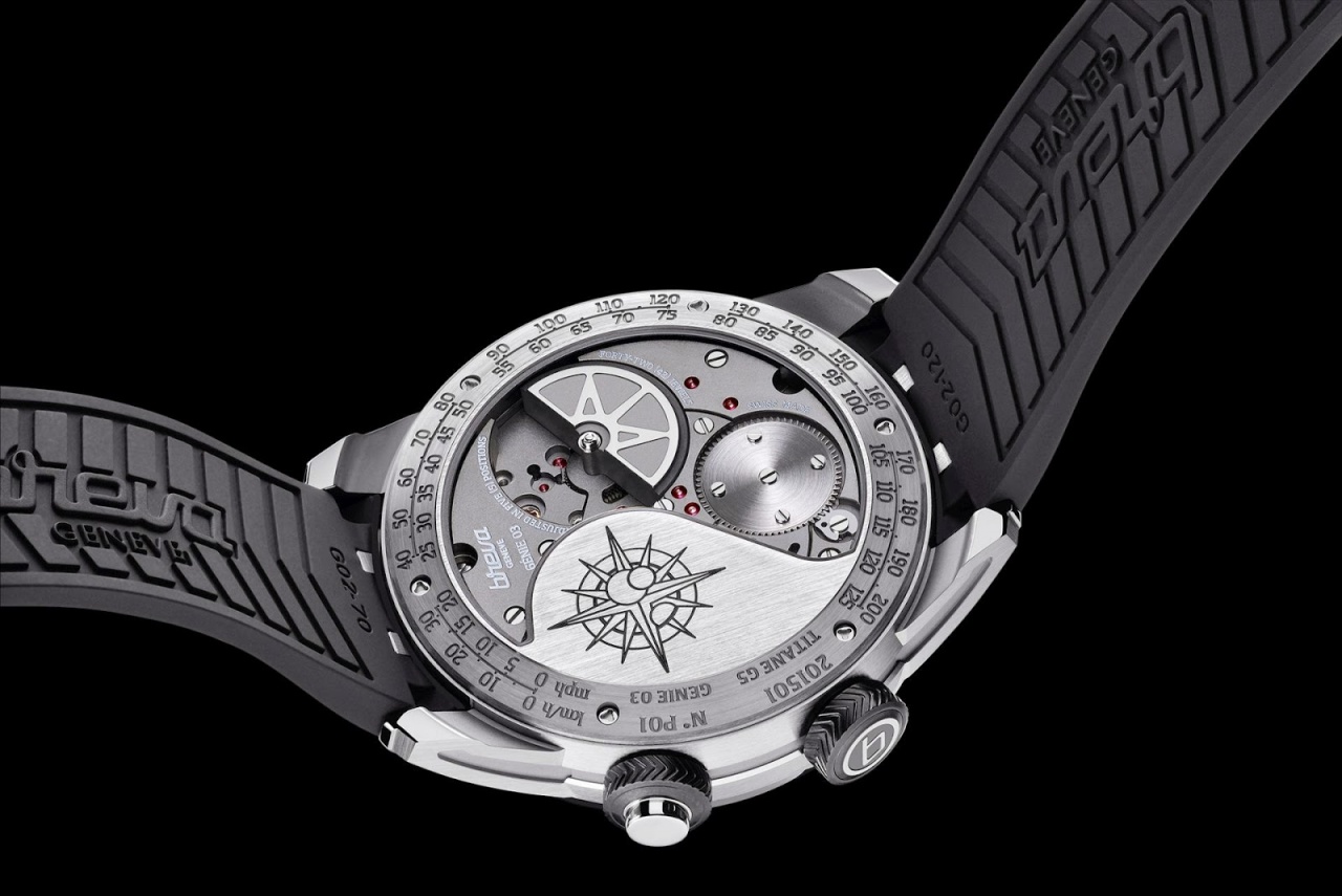 Новая модель Génie 03 от швейцарской часовой компании Breva позиционируется производителем в качестве первых в мире наручных часов с функциональным спидометром. Последний представляет из себя, по-сути, вмонтированный в часовой корпус модифицированный мини-анемометр, который при измерении скорости движения транспортного средства открывается (выдвигаясь вверх) и подставляется под встречный поток воздуха.