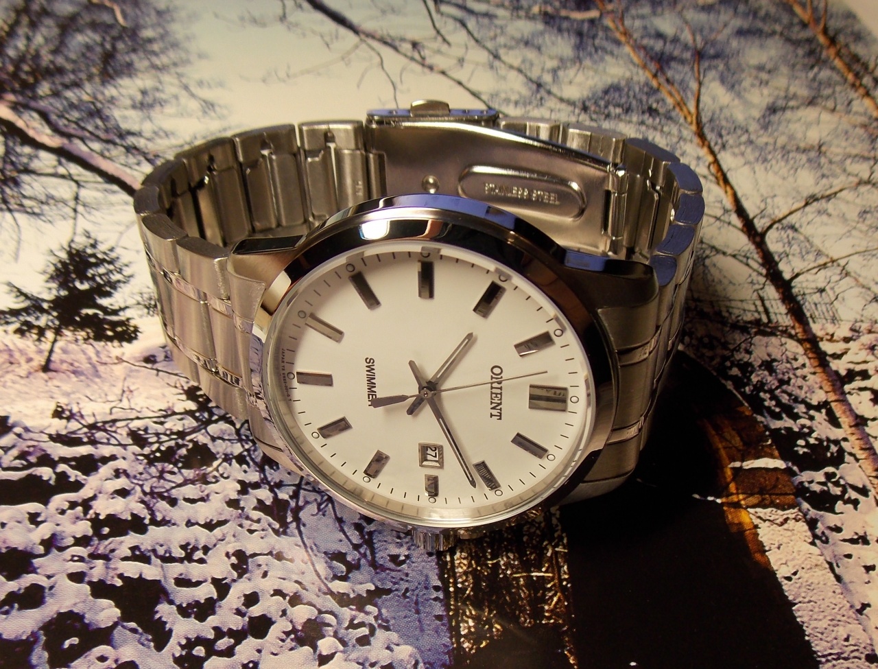 Делаю обзор на свои новые часы Ориент, по принципу - чтобы было. Нигде по артикулу я эти часы найти в инете не мог. Пусть будут здесь на форуме. Может кто-нибудь когда-нибудь будет их "гуглить" и помянет меня добрым словом. Мужские (45мм с головой), стальные, стекло минеральное, кварцевые 2 камня. Браслет сначала я не признал, всё литьё любил. Но на этот раз я от браслета в восторге. Прочный, упругий, широкий (22мм) и стойкий к царапинам, оттого и товарный вид сохраниться дольше. Я, конечно, не увероен, но мне так кажется. :) Сделаны хоть и в Японии, но вскоре обнаружился "косячок",- секундная стрелка встала прямо на глазах. Стукнул пальцем по стеклу - вроде пошла. Пришлось разобрать и зубочисткой прижать стрелку к циферблату,- зацепилась за стекло. Меня это не коробит. Часы отличные! Идут секунда в секунду! И цена - две четыреста новыми рублями - считай даром! :)