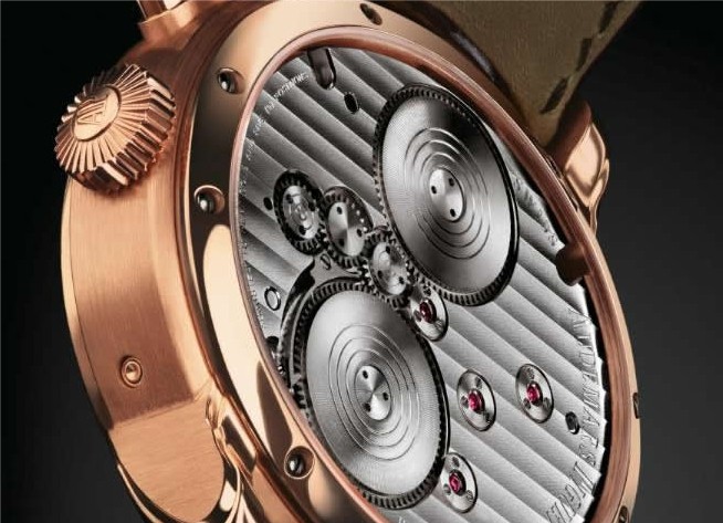Корпус размером 47 х 42 мм выполнен из 18-каратного розового золота.