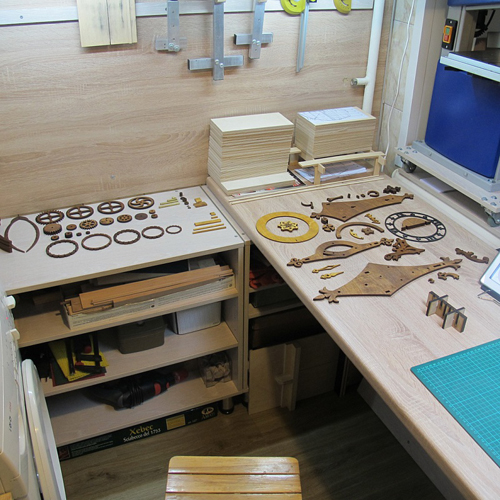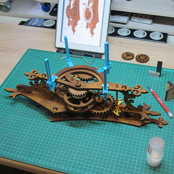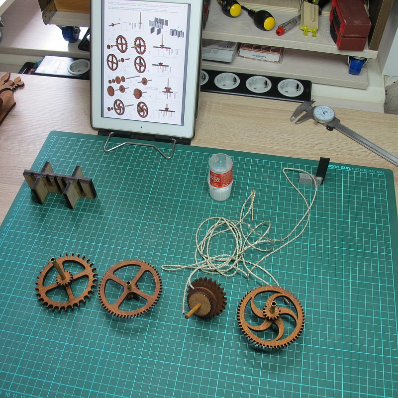Лазерная резка. Обугливание краев, так же как и использование фанерных деталей тут особой роли не играет, т.к. все детали уже покрыты морилкой и имеют конечный вид, т.е. никакой отделки от потребителя не требуют - только сборка. Вложение 956909 Как мы позже выяснили, один мешочек всё же оказался лишним, так что делайте поправку если что. Вложение 956910 Вложение 956921 Первым делом разложил детали так, как они лежали в партлистах инструкции, чтобы не выискивать их в процессе сборки. Настоятельно рекомендую, т.к. иначе не мудренно запутаться в осях, трубках, шплинтах, рычагах и прочем мелком кругляке. С шестеренками и каркасными деталями процесс опознания не доставляет никаких проблем. Вложение 956911 Вложение 956912 Вложение 956916 Клеим строго по инструкции. Использовал клей для дерева Titlebond. Т.к. моей задачей было протестировать собираемость, то работу механизма я понять заранее не пытался. Просто прочел инструкцию от начала до конца, а затем начал по возможности внимательно собирать часы выполняя инструкцию страница за страницей. Почему внимательно по возможности? Потому что моему малому идея сего набора чрезвычайно понравилась и он активно мешался под ногами и бомбил меня вопросами типа что, как, зачем и "когда ты уже их доделаешь, папа" :) Я мысленно ругался, не подавал вида и в связи с этим очень собой гордился :) Что важно? Стараться всё выставлять максимально вертикально. тогда не возникает проблем со всяческими совмещениями деталей. Вложение 956917 Вложение 956918 Для позиционирования деталей, нанизываемых на различные оси механизма даётся довольно удобный шаблон: Вложение 956919 Маркировка деталей на нем очень кстати: Вложение 956920 Продолжение следует... |