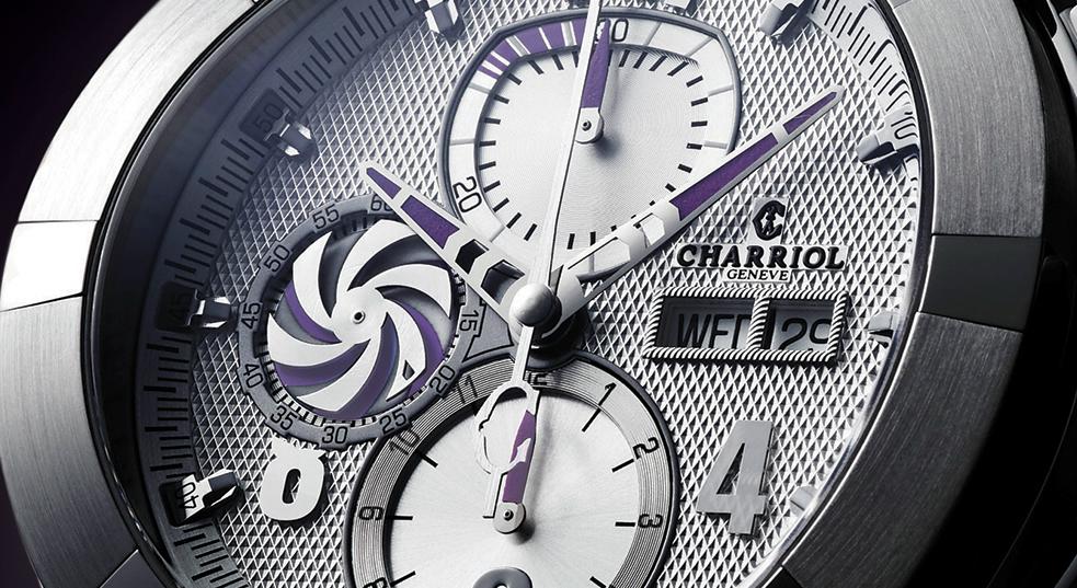 Круглый, слегка изогнутый, корпус новинки изготовлен из нержавеющей стали, диаметром 46,0 мм, водонепроницаемый до 100 метров. Заводная головка с черной резиновой накладкой, расположена на 3 часах, а пушеры хронографа - на 2 и 4 часах. Сапфировое стекло установлено на передней стороне часового корпуса и на его завинчивающейся задней крышке. Циферблат серебристого цвета, гильошированный, с накладными арабскими цифрами и часовыми индексами и стрелками, покрытыми люминесцентным составом SuperLuminova фиолетового цвета. Модель оснащена швейцарским автоматическим механизмом ETA Valjoux 7750, на 25 камнях, с балансовой частотой 28800 полуколебаний в час (4 гц), 42-часовым запасом хода, функциями индикации часов, минут (посредством соответствующих центральных стрелок), секунд (посредством соответствующей стрелки, выполненной в виде колеса турбины, на малом боковом циферблате, расположенном на 9 часах), дня недели и даты (посредством соответствующих буквенного и цифрового указателей в сдвоенных прямоугольных апертурах, расположенных на 3 часах), а также с хронографом (центральная секундная стрелка с объемным логотипом бренда Charriol на ее противовесе, круглый аналоговый 30-минутный счетчик, расположенный на 12 часах и круглый аналоговый 12-часовый счетчик, расположенный на 6 часах). Поставляется на браслете из нержавеющей стали. Вложение 943015 Источник: http://forums.timezone.com/index.php...=0#msg_6962213 |