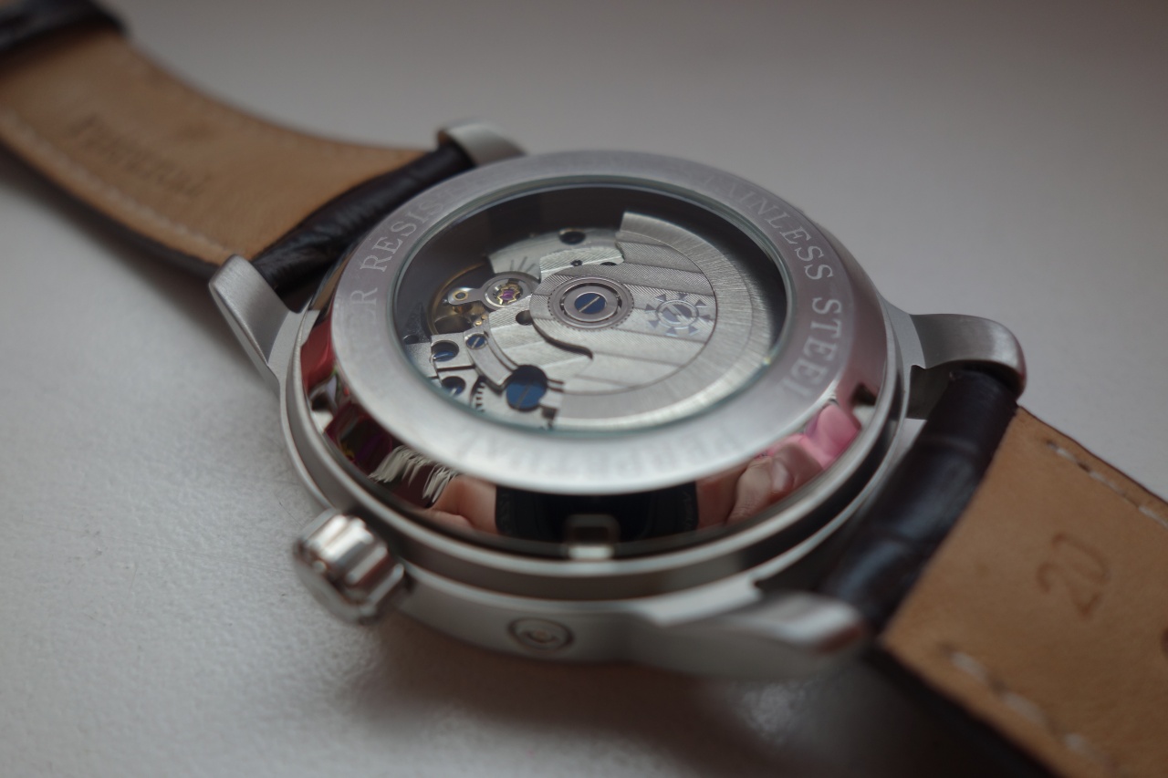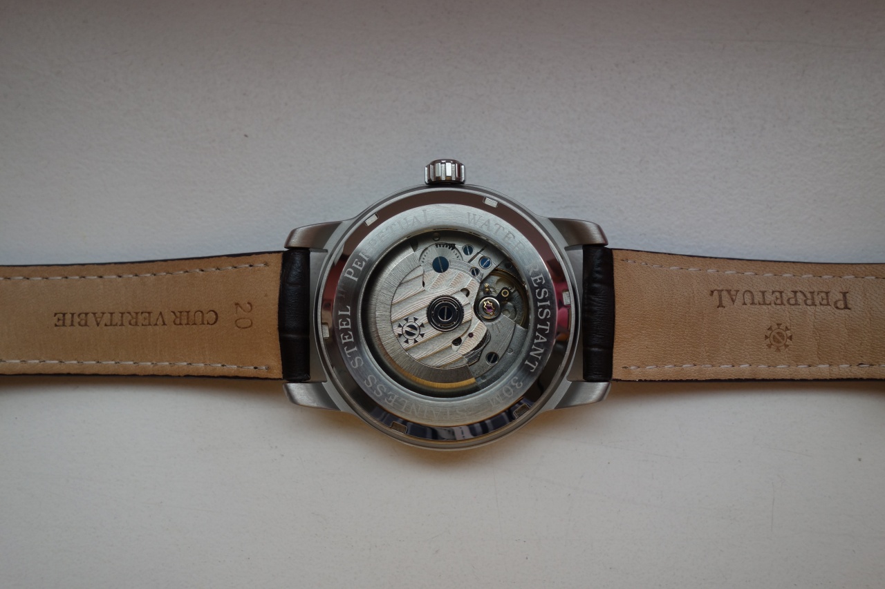 Как оказалось, на просторах интернета, в основном на watchuseek.com, но и здесь на форуме тоже, есть владельцы часов этой фирмы, но как ни странно, немного живых фотографий самих часов, в основном с телефона и на руке. Вложение 944583 Общая информация о часах есть на официальной странице http://www.perpetual-watch.com/Pointer.html , тем не менее: механизм SH R12 с частотой колебаний 21'600, 35 камнейВложение 944584 Часы выглядят отлично с точки зрения возможностей человеческого глаза, т.е. заметить некие нюансы или недочеты можно уже либо с лупой, либо с макросъемкой фотоаппаратом. У меня появились определенные замечания к отделке, циферблату и механизму, но я думаю трудно сделать лучше за заявленную цену часов в 170 долларов с учетом частичной ручной сборки. Т.е. выпуская такие часы в промышленных масштабах на заводе, думаю качество было бы выше, но не намного и именно благодаря отлаженному процессу. Если же делать такие часы в полуручном режиме и повысить качество, то и цена конечно должна была бы вырасти пропорционально затраченному времени. По поводу точности могу сказать, что идут не хуже\не лучше заявленной, где-то 10-15 сек в плюс так и есть пока. Ремешок у часов хороший, достаточно мягкий, и точно не дубовый. Размер 20 мм. Сделан хорошо, застежка-бабочка защелкивается легко, но при плотном обхвате руки, может также и расстегнуться при давлении. Ремешок как ремешок, при желании заменяется любым другим. Вложение 944644 Толщина часов примерно 13 мм, что вкупе с размером корпуса в 41 мм из стали и шириной ремешка в 20 мм делает их ощутимыми на руке, я бы даже сказал несколько тяжеловесными с учетом того, что часы предполагаются классическими. Другими словами меньшая толщина корпуса + меньший диаметр сделали бы их только лучше. Полагаю, 10 мм толщина и 39 мм диаметр тут гораздо лучше подходят. Скажем так, если задняя крышка была бы плоской, то часы, как раз, стали бы около 10 мм толщиной, и лучше прилегали к руке. Вложение 944641 На заводной головке расположен логотип фирмы, сама головка достаточно крупная и вполне удобная. Корпус отполирован по разному. Верхняя накладная часть - блестящая полировка, сам корпус - матовая полировка, задняя крышка - блестящая полировка. Вложение 944587Вложение 944580Вложение 944582 Циферблат сделан\отделан очень хорошо, стрелки и их окраска также на уровне. Лунный календарь содержит 29 положений, претензий к нему пока нет. Перевод календаря осуществляется утопленной кнопкой на 8 часах, перевод даты осуществляется утопленной кнопкой на 4 часах. Стекло сапфировое, на счет антиблика не уверен, хотя раз заявлено, то скорее всего правда. Видел некоторые замечания, что стекло отдает синевой или фиолетом, это кстати видно даже на фотографиях с официального сайта, вот например здесь http://www.perpetual-watch.com/images/moonphase_III.JPG . Не знаю, так сфотографировали неудачно или на самом деле было такое стекло, но на моих часах я такого фиолетового отлива не заметил. Возможно прогресс не стоит на месте и сейчас уже ставят более качественные стекла. Вложение 944606 Задняя крышка корпуса прозрачная, на роторе автоподзавода также выгравирован логотип компании, как видно, проведена небольшая косметическая отделка автоподзавода и еще некоторых деталей. Конечно, уровень отделки нельзя сравнивать по качеству со швейцарскими часами. Но тем не менее это говорит о некой ручной доводке деталей механизма, что влече