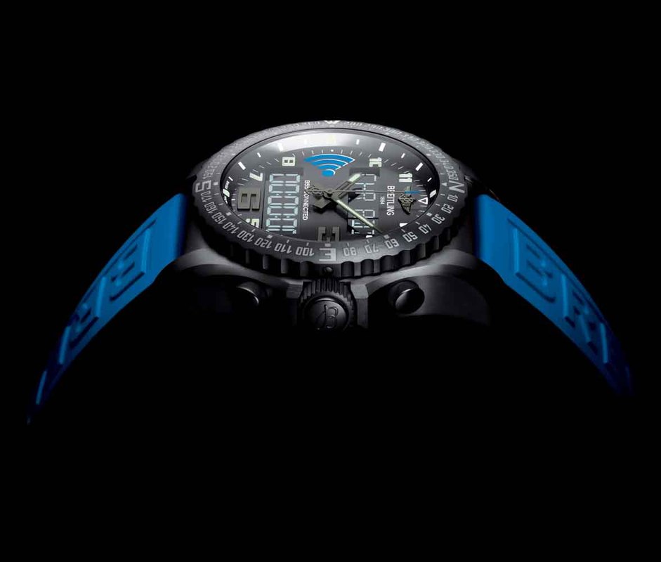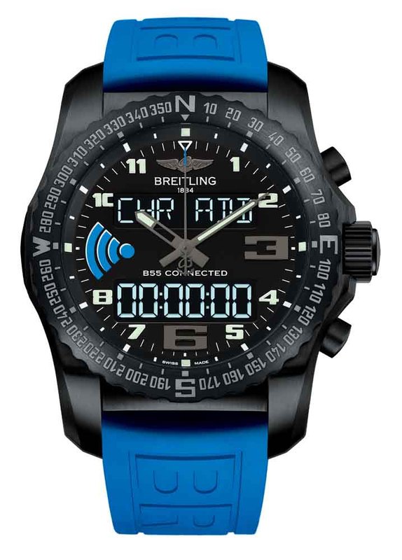 У Breitling не возникало сомнений в возможности превращения часов в функциональное дополнение к смартфону. Хронограф остается абсолютной доминантой, и подключение к смартфону направлено, главным образом, на упрощение его использования. Двусторонняя коммуникация позволяет двум приборам создать идеальную взаимодополняющую пару, в которой каждый элемент используется для того, что он делает лучше. Поскольку главными преимуществами смартфона являются его экран и эргономичный интерфейс, владельцы B55 Connected могут использовать свой телефон для выполнения некоторых корректировок (настройки времени, часовых поясов, будильников, параметров дисплея и режимов работы, ночного режима и т.д.). Результатом является значительное повышение удобства и эффективности. И наоборот, пользователь может также загрузить результаты различных измерений (времени полета и т.д.) с хронографа на смартфон, чтобы ему было легче воспринимать, хранить или передавать их. Новая система часов с подключением к цифровым устройствам, разработанная Breitling, тем самым обеспечивает возможность использования функций хронографа и сохраняет дух настоящих приборов для профессионалов. B55 Connected также отличает их ультра-техничный внешний вид, который создает титановый корпус с черным покрытием на основе углерода и циферблат, украшенный синим символом беспроводной связи. Эта оригинальная черно-синяя тема продолжается и на прочном каучуковым ремешке.
