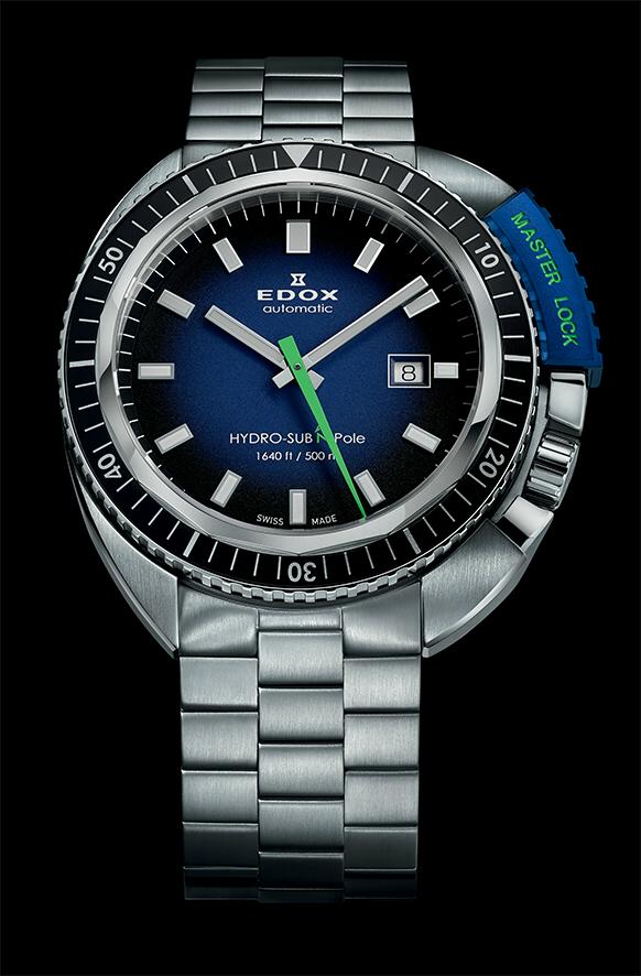 Корпус новинки изготовлен из нержавеющей стали, диаметром 46,0 мм (такой относительно большой диаметр обусловлен наличием на правой стороне корпуса синего ползунка с зеленой надписью "Master Lock", прикрывающего заводную головку после установки времени и даты), водонепроницаемый до 500 метров. Защищенная завинчивающаяся рифленая заводная головка расположена на 4 часах. Вращающийся однонаправленный дайверский безель с черным покрытием, выполненный из алюминия. Задняя крышка часового корпуса глухая, завинчивающаяся, с гравированным изображением Северного полушария с точкой Северного пояса в его центре. Сапфировое стекло защищает циферблат синего цвета с белыми накладными часовыми индексами, покрытыми, как и белые же часовая и минутная стрелки, с белым люминесцентным покрытием. Секундная стрелка - зеленого цвета.