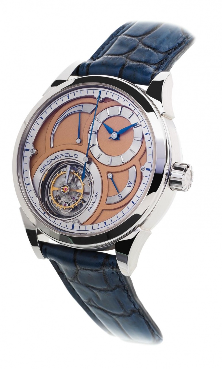 На международной часовой выставке Baselworld-2015, которая состоялась в прошлом месяце, голландская часовая компания Grönefeld официально представила свою новую лимитированную модель Parallax Tourbillon Platinum. Название модели ("Parallax") происходит от термина "паралакс" - изменение видимого положения объекта относительно удалённого фона в зависимости от положения наблюдателя. Речь в данном случае идет о сведении к минимуму возможности ошибки из-за параллакса при визуальной индикации секунд путем максимального приближении указателя центральной секундной стрелки к поверхности соответствующей шкалы на циферблате.