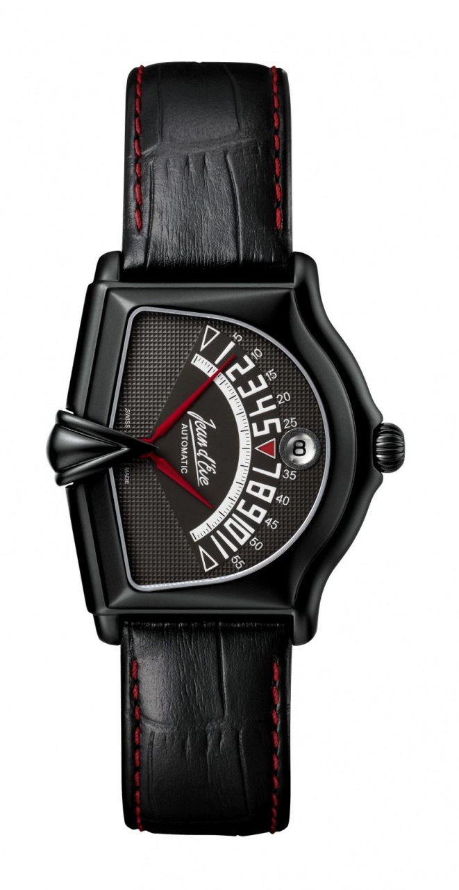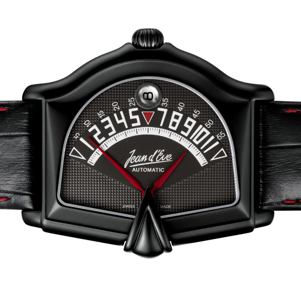 Новая модель Sectora II Retrograde Automatic от швейцарской часовой компании Jean d'Eve имеет корпус неправильной формы, изготовленный из нержавеющей стали с черным DLC-покрытием, длиной 46,0 мм, шириной 37,5 мм, водонепроницаемый до 30 метров. Рифленая, луковицеобразной формы, защищенная заводная головка расположена на 3 часах. Сапфировое стекло установлено на передней стороне часового корпуса и на его задней крышке. Циферблат гильошированный, темно-серого цвета, с секторной шкалой, шириной в 120 градусов, градуированной белыми арабскими цифрами. Стрелки красного цвета.