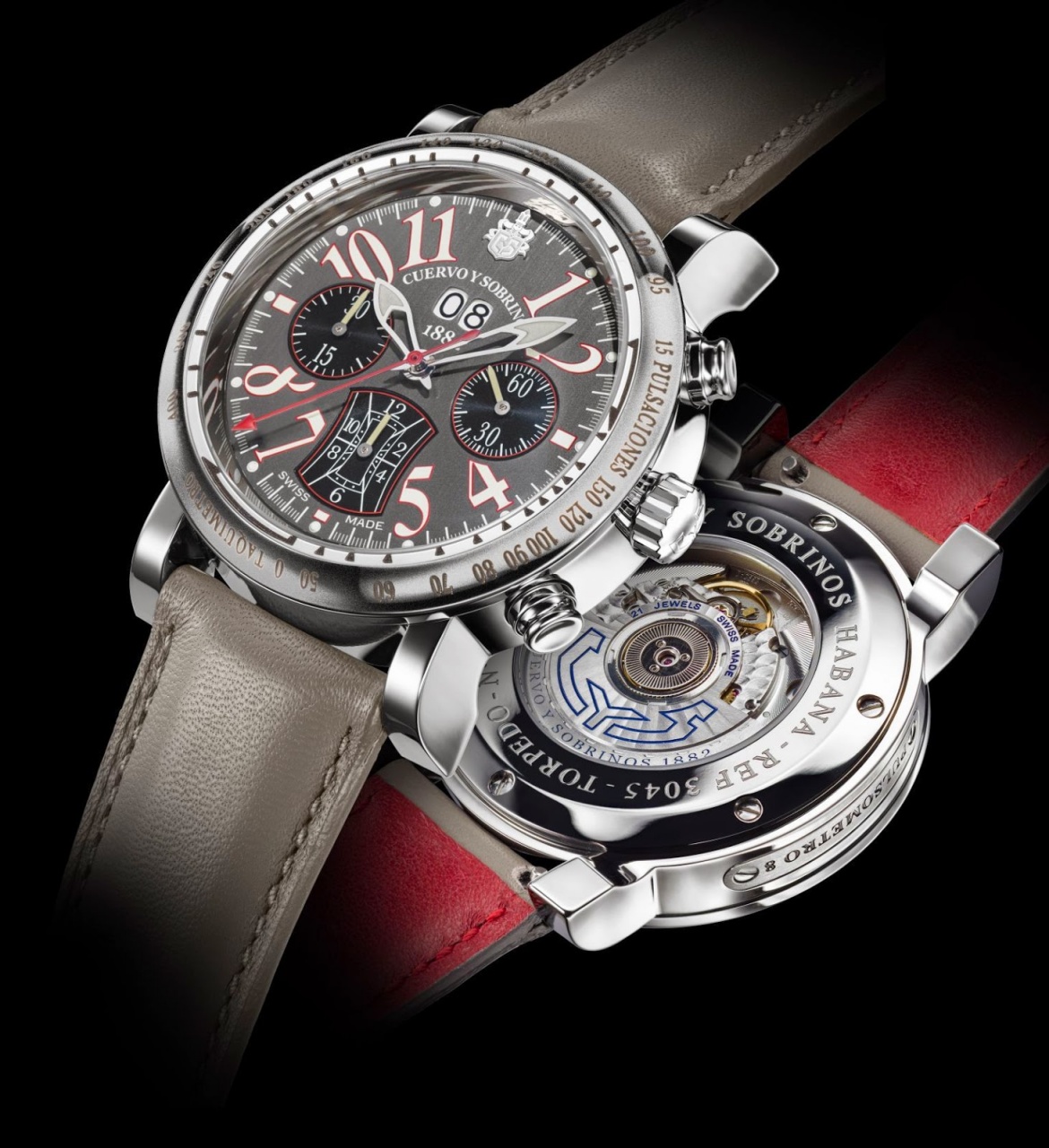 Новая лимитированная модель Torpedo Cronógrafo "Pulsometro & Taquimetro" Limited Edition (Ref. 3045.1GLE) от от швейцарского бренда с кубинскими корнями Cuervo y Sobrinos имеет круглый корпус, изготовленный из нержавеющей стали, диаметром 43,00 мм, толщиной 12,85 мм, водонепроницаемый до 50 метров. На выпуклом торце рифленой заводной головки, расположенной на 3 часах, выгравирован логотип бренда Cuervo y Sobrinos. На гладком фиксированном безеле нанесены тахиметрическая и пульсометрическая шкалы. Сапфировое стекло установлено на передней стороне часового корпуса (с антибликовым покрытием) и на его завинчивающейся задней крышке. Циферблат темно-серого цвета, с черными малым боковым циферблатом и счетчиками хронографа, с напечатанными белыми арабскими цифрами с красной окантовкой, а также с точками на часовых метках, покрытыми, как и мечевидные часовая и минутная стрелки, люминесцентным составом SuperLumiNova белого цвета.