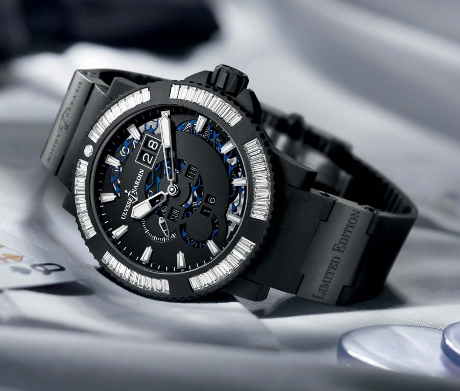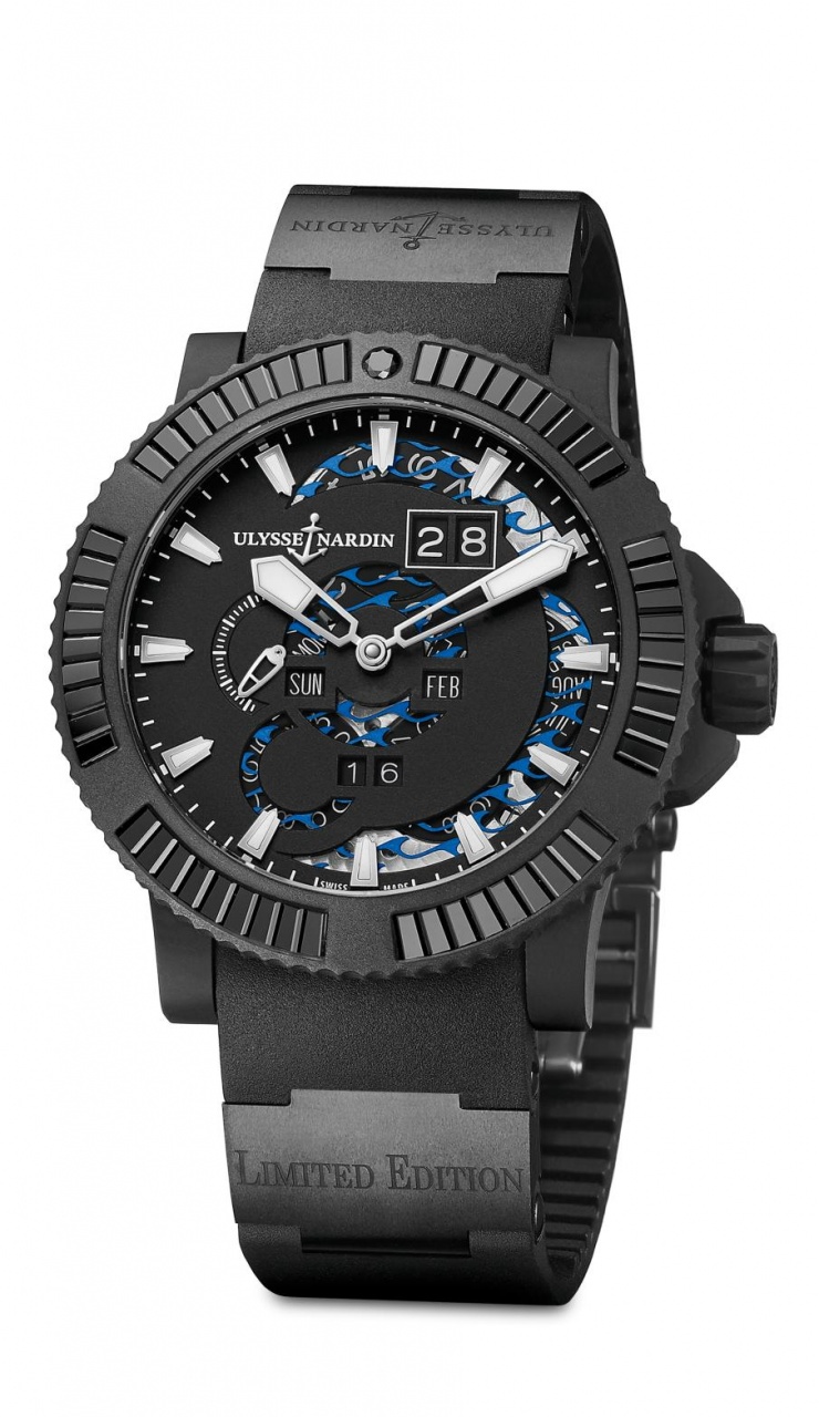 - с безелем, инкрустированным 54 бриллиантами багетной огранки (Ref. 333-92B0-3C/923, лимитированный выпуск 28 экземпляров); - с безелем, инкрустированным 54 голубыми сапфирами багетной огранки (Ref. 333-92B3-3C/923, лимитированный выпуск 28 экземпляров); - с безелем, инкрустированным 54 красными сапфирами багетной огранки (Ref. 333-92B6-3C/926, лимитированный выпуск 28 экземпляров); - с безелем, инкрустированным 54 зелеными сапфирами багетной огранки (Ref. 333-92B8-3C/928, лимитированный выпуск 28 экземпляров); - с безелем, инкрустированным 54 черными керамическими багетами (Ref. 333-333-92B2-3C/923, лимитированный выпуск 99 экземпляров). Круглый корпус новинки, изготовленный из нержавеющей стали с матово-черным резиновым покрытием, диаметром 45,8 мм, водонепроницаемый до 200 метров. На торце защищенной завинчивающейся рифленой заводной головки, расположенной на 3 часах, выгравировано изображение эмблемы и логотипа бренда Ulysse Nardin. Общий вес бриллиантов или сапфиров, инкрустированных в безель, составляет 3,78 карат. Циферблат матово-черного цвета, с фигурными апертурами, напоминающими морские волны, с накладными часовыми индексами, покрытыми, как и часовая и минутная стрелки, люминесцентным составом SuperLuminova белого цвета. Модель оснащена мануфактурным швейцарским автоматическим механизмом UN-33, на 27 камнях, с балансовой частотой 28800 полуколебаний в час (4 гц), 48-часовым запасом хода, с функциями индикации часов, минут (посредством соответствующих центральных стрелок), секунд (на соответствующем малом боковом циферблате, расположенном на 9 часах), даты (посредством соответствующего цифрового указателя в большой сдвоенной апертуре, расположенной на 13 часах), дня недели и месяца (посредством соответствующих буквенных указателей в прямоугольных апертурах, расположенных на 8 и 4 часах) и года (посредством соответствующего цифрового указателя в сдвоенной апертуре, расположенной на 6 часах). Эксклюзивная опция калибра – возможность перемещать индикаторы календаря как в прямом, так и в обратном направлениях - осуществляется путем нажатия на заводную головку. Калибр отлично отделан и декорирован. Поставляется на черном каучуковом ремешке с двумя керамическими элементами и со стальной раскладной застежкой. Вложение 997864Вложение 997865Вложение 997866Вложение 997867Вложение 997868 Вложение 997869 Источник: http://forums.timezone.com/index.php...=0#msg_7018176 |