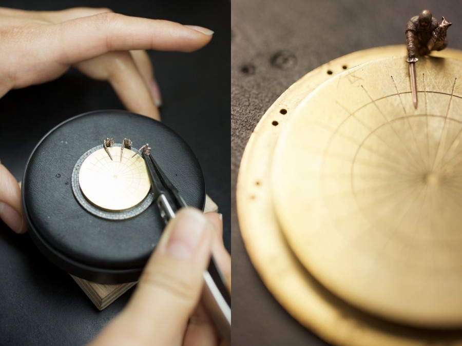 Целый день работы уходит на то, чтобы изготовить одну фигурку, представляющую собой трехмерную отливку из бронзы с тщательно вырезанными и обработанными вручную деталями, в том числе с трехмерной микрогравировкой. В отличие от золотых фигурок на исходной модели, здесь впервые была выбрана бронза в качестве материала для микрогравировки. Это несколько усложнило обработку, однако легкий налет бронзовой патины позволяет акцентировать контрасты этого уникального шедевра. Как можно было предполагать от работы такой сложности и утонченности, выполнение микрогравировки на фигуре одного рыцаря занимает целый день, а за месяц удается сделать всего два циферблата. Сатинированный круглый фланец из белого золота, окружающий центр циферблата, покрыт гравировкой и патиной. Для достижения зрительного эффекта «булыжной мостовой» потребовалось огромное мастерство и терпение.