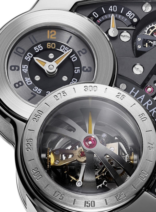 В левой части циферблата часы и минуты регулируются трехосным турбийоном. Стрелки оранжевого цвета и другие акценты выделяют особенности этого механизма от характерных свойств, находящихся справа. Первая каретка трехосного турбийона, в которой находится колесо баланса, выполняет один оборот каждые 45 секунд. Она вращается внутри второй каретки, совершающей оборот вокруг самой себя по вертикальной оси за 75 секунд. Весь этот ансамбль интегрирован в третью каретку, сферической формы, которая совершает оборот за 300 секунд (как отмечено на шкале с оранжевой стрелкой.