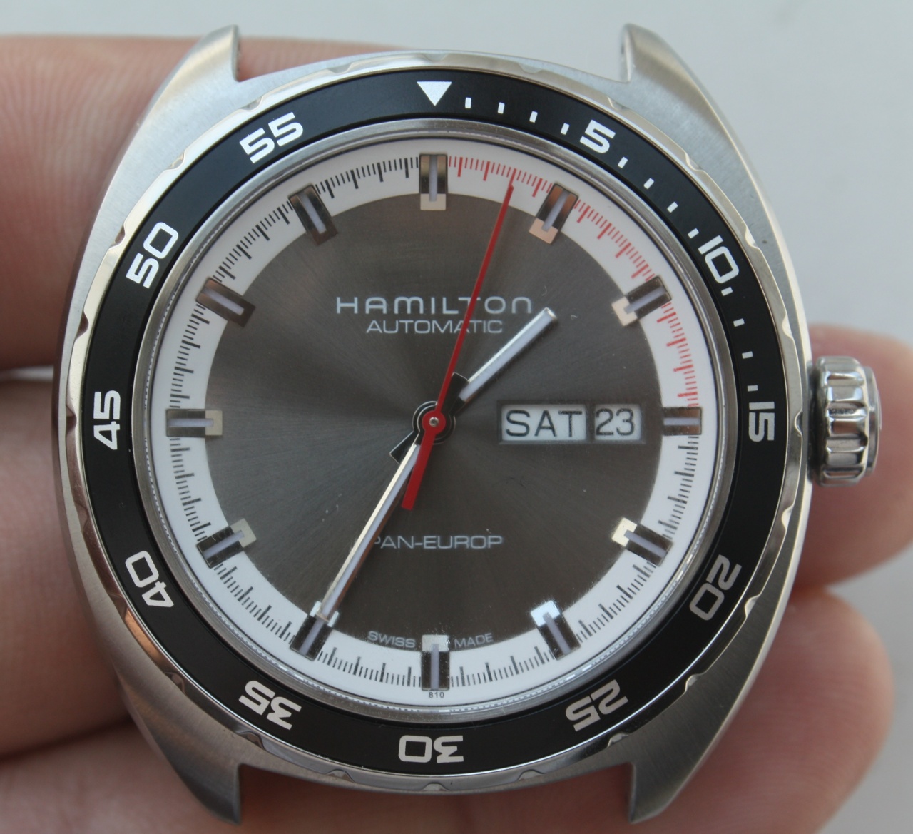 Если Вам лень читать этот обзор, то видео обзор на 24 минуты лежит ЗДЕСЬ: Ниже тот же текст, что и в видео обзоре, но с фотографиями. Многие фото получились лучше, чем видео. __________________________________________________________________________________________________ Часы Хэмильтон серии Pan Europ имеют историю. Линейка таких часов была выпущена компанией в 1960-х годах. На барахолках мира до сих пор можно встретить часы этой серии тех лет в рабочем состоянии. Как с функцией хронографа и даты так и без хронографа, так с поворотным безелем, так и без него. Вложение 1018016Вложение 1018018Вложение 1018017 Дизайн потомков Pan Europ 2010-ых похож на дизайн предшественников 1960-ых. Поэтому, глядя на новые часы прослеживается родство и хорошо просматривается стиль ретро в новых часах. Добавим к этому хороший механизм и разумную цену... Что может быть лучше в начальной ценовой категории швейцарских часов? Вложение 1018025 В начале продолжительного обзора поделюсь с Вами, что часы эти куплены мной очень быстро и неожиданно. Куплены не «потому что», а «вопреки». Ведь часы эти были совсем не тем, что я подыскивал в течение двух месяцев: - в них не нет металлического браслета, который я хотел. - нет цифр на циферблате, - нет 10 и более бар водонепроницаемости, которые мне нужны, - на них был безель спортивного типа с цифрами, который я не хотел. - они в стиле кэжуал (даже полуспорт), хотя я хотел более консервативные часы, ближе к «костюмникам». В общем многое в них не так, как мне надо было и они отличались сильно от того, что я хотел иметь по функционалу. Зато в них есть душа, какая-то фишка, они для меня почти безупречны по внешнему виду. Они меня «зацепили» чем-то, не понятно чем. Я их просто увидел на фото и полюбил. И понял, что они мне нужны. Понял, что именно они моя мечта. А как же полный функционал, как я хотел? Да и фиг с ним... главное душа! Но справедливости ради надо всё же сказать, что на мой выбор повлияло то, что я знал о качестве Хэмильтон, знал, что в этой модели надежный и с очень большим для механики запасом хода калибр (о механизме подробнее скажу позже). Также немножко повлияла и простая жадность - все же в комплекте не только часы на ремешке, но есть также бонусы! Все эти обстоятельства вместе привели меня к покупке этих замечательных часов. На днях и их наконец-то получил. И они мне в живую нравятся ещё больше, чем в фото и виде обзорах других авторов. А что не нравится, узнаете по ходу обзора. ______________________________________________ Теперь предметнее о часах, комплектации, функциях. Вложение 1018101 1. Коробка у часов большая, больше чем у большинства часов Хэмильтон. В черной коробке с отделкой под кожу и черным бархатом внутри находятся часы на черно-красном ремешке с застежкой типа «бабочка» и перфорацией; часы на подушечке, отдельно лежит текстильный синтетический трёхцветный ремешок на пряжке; фирменный и качественный инструмент Хамильтон для замены ремешка самостоятельно. Именно по этой причине я назвал часы двуликими: достаточно быстро стиль часов можно изменить исходя из вашего выбора в одежде, сменив ремешок. Под коробкой находится инструкция на все механизмы, которые использует Хэмильтон. Она на многих языках, в том числе и на русском. Там же международная гарантия на два года, которая должна быть заполнена продавцом. В моём случае им был греческий магазин. Пластиковой карточки, гарантии Хэмильтон, почему - то в комплекте не б