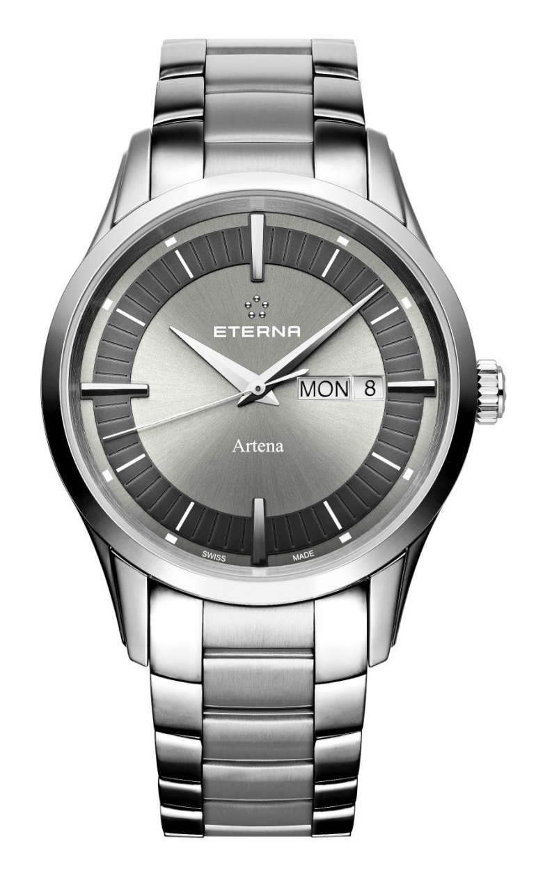 Новая модель Artena от швейцарской часовой компании Eterna имеет круглый корпус, изготовленный из нержавеющей стали или из нержавеющей стали с PVD-покрытием розовым золотом, диаметром 40,0 мм, водонепроницаемый до 50 метров. На торце рифленой заводной головки, расположенной на 3 часах, выгравировано изображение пентаграммы из шариков от шарикоподшипника - эмблема бренда Eterna. Сапфировое стекло защищает циферблат антрацитового или серебристого цвета с лучистой отделкой его центральной части, с накладными и напечатанными часовыми индексами, стальными часовой и минутной стрелками, выполненными в стиле Dauphine.