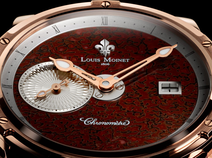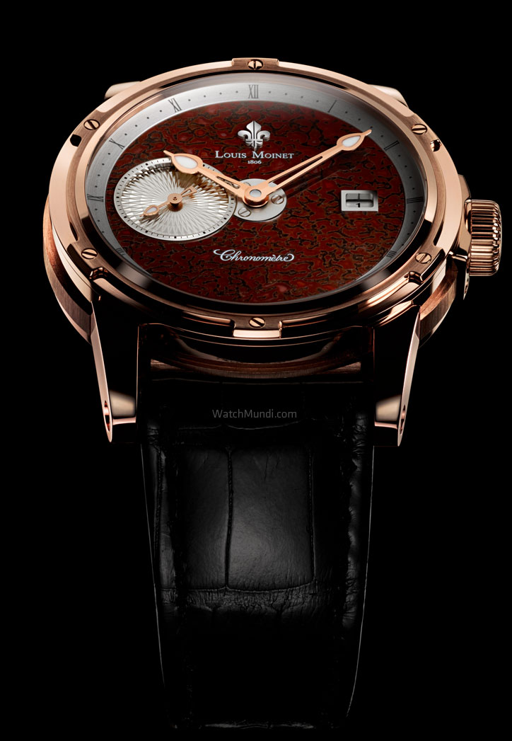 Круглый полированный корпус, изготовленный из 18-каратного розового золота, с фиксированным безелем на шестью винтах, диаметром 43,50 мм, толщиной 15,60 мм, водонепроницаемый до 50 метров. На торце рифленой заводной головки, расположенной на 3 часах, выгравирована эмблема бренда Louis Moinet. Сапфировое стекло установлено на передней стороне корпуса (с двусторонним антибликовым покрытием) и на его завинчивающейся задней крышке. Циферблат с золотыми стрелками, покрытыми люминесцентным составом белого цвета, а также с напечатанными римскими цифрами, расположенными на белом фланце.