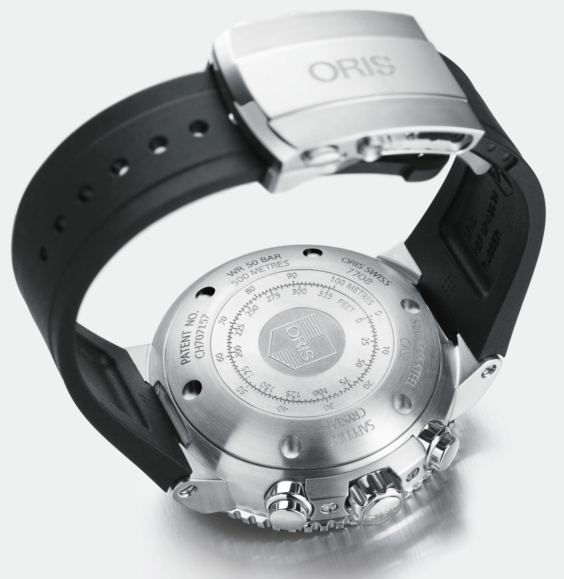 Дизайн новой модели Aquis Depth Gauge Chronograph (Ref. 774 7708 4154 Set) от швейцарской часовой компании Oris выполнен в классическом дайверском стиле. Она отличается наличием глубинометра, который впервые был применен компанией Oris в 2013 году в модели Aquis Depth Gauge. Глубинометр устроен следующим образом: на 12 часах в сапфировом стекле имеется отверстие, через которое, при погружении, вода поступает в круглый тонкий канал, который корреспондируется, на периферии циферблата, с желтой шкалой, градуированной в метрах.