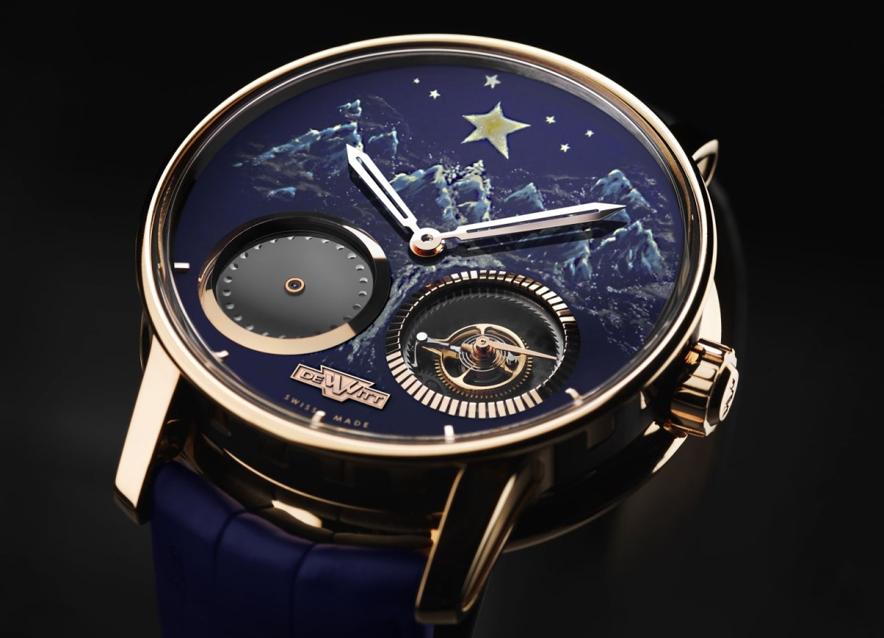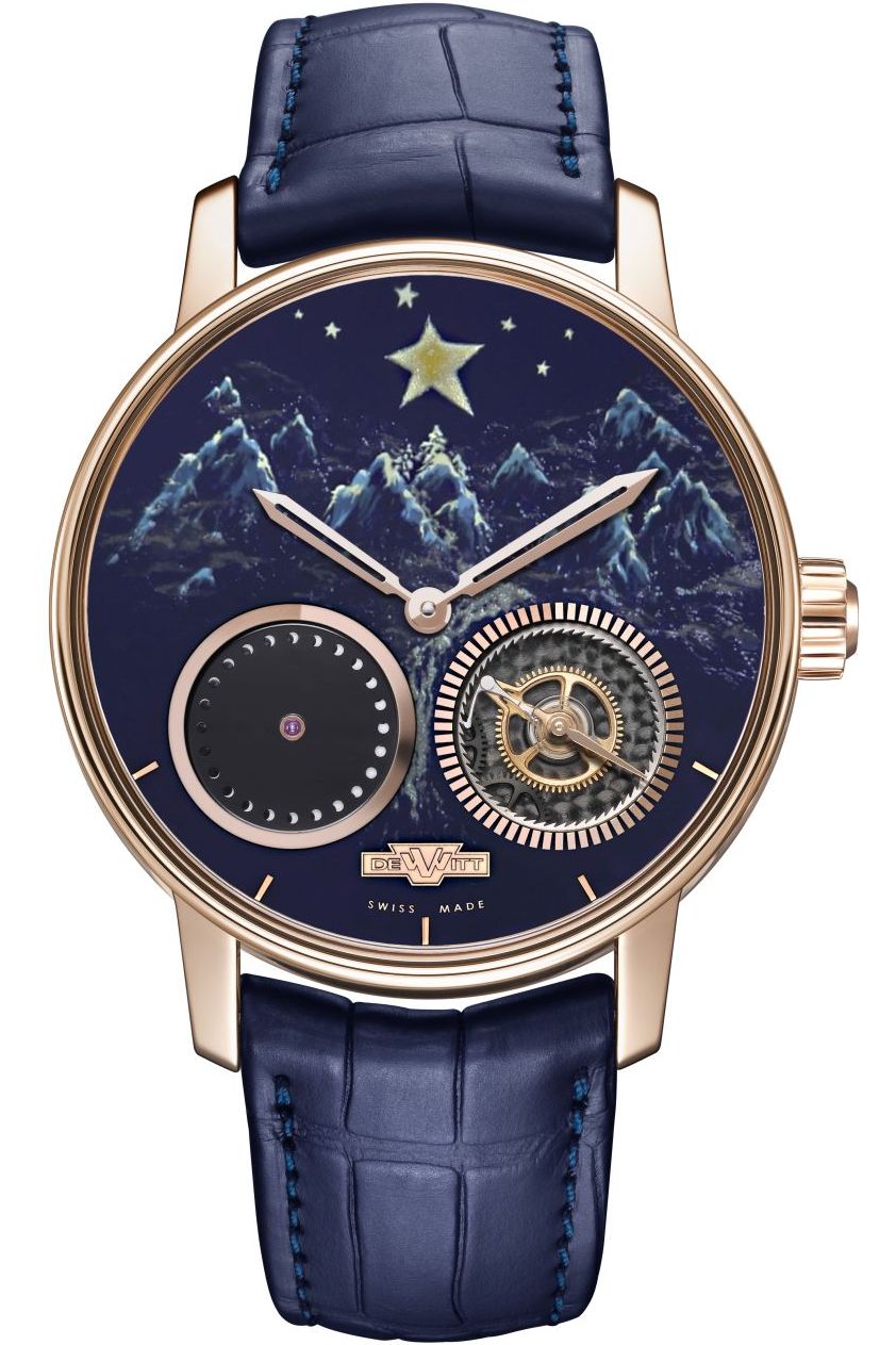 Новинка имеет круглый полированный корпус, изготовленный из 18-каратного розового золота и черной резины, с имперскими колоннами DeWitt на его боковой стенке, диаметром 42,50 мм, толщиной 12,85 мм, с 21-миллиметровым расстоянием между ушками, водонепроницаемый до 30 метров. На торце рифленой заводной головки, расположенной на 3 часах, выгравирован логотип бренда DEWITT (буква "W"). Сапфировое стекло установлено на передней стороне корпуса и на его завинчивающейся задней крышке. Циферблат лаковый, синего цвета, с художественным изображением гор и звездного неба, с продолговатыми накладными золотыми часовыми индексами, расположенными на 4,5,6,7 и 8 часах. Часовая и минутная стрелки скелетонизированные, мечевидной формы, выполненные из 18-каратного розового золота. Модель оснащена мануфактурным швейцарским автоматическим механизмом DEWITT DW1201, диаметром 30,6 мм, состоящим из 217 деталей, на 38 камнях, с балансовой частотой 21600 полуколебаний в час (3,0 гц), 65-часовым запасом хода, функциями индикации часов и минут (посредством соответствующих центральных стрелок) и секунд, посредством двух указателей: - на малом боковом циферблате, расположенном между 4 и 5 часами, с помощью стрелки, реализующей усложнение "мертвая секунда" или "dead-beat" - это усложнение в механических часах, состоящее в том, что секундная стрелка визуально двигается не плавно, то есть с частотой 6-8 движений в секунду, а скачками, как на кварцевых часах - один прыжок в секунду); - на круглом указателе, расположенном между 7 и 8 часами, разработанный DeWitt и названный им "free seconds hand". Этот указатель, по заявлению производителя, "символически представляет противостояние между режимом реального и виртуального времени, которое мы не можем измерить с помощью обычных методов". Поставляется на синем ремешке из кожи аллигатора с застежкой из 18-каратного розового золота. Вложение 1055690 Источник: http://www.masterhorologer.com/2015/...me-unique.html |