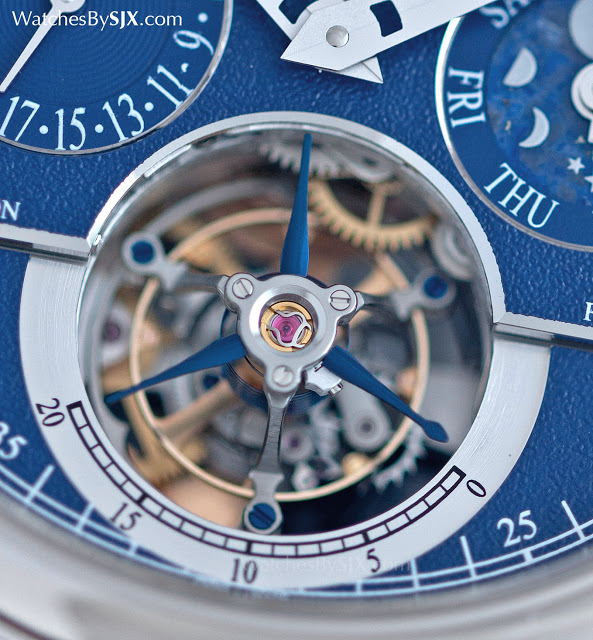 Круглый полированный корпус новинки изготовлен из 18-каратного белого золота, диаметром 42,00 мм, водонепроницаемый до 50 метров. Рифленая заводная головка расположена на 3 часах. Сапфировое стекло установлено на передней стороне корпуса и на его задней крышке. Циферблат синего цвета с накладными продолговатыми часовыми индексами; дизайн часовой и минутной стрелок выполнен в стиле Dauphine. Модель оснащена мануфактурным швейцарским автоматическим механизмом Jaeger-LeCoultre 985, собранным, великолепно отделанным и декорированным вручную, с функциями индикации часов, минут (посредством соответствующих центральных стрелок), секунд (посредством вороненых стрелок, установленных на круглой каретке парящего турбийона в круглой апертуре, расположенной на 6 часах), даты (посредством соответствующего круглого аналогового указателя, расположенного на 9 часах), дня недели и фаз Луны (посредством соответствующих совмещенных круглых аналоговых указателей, расположенных на 3 часах), месяцев (посредством соответствующего круглого аналогового указателя, расположенного на 12 часах) и года (посредством соответствующего цифрового указателя в двух апертурах, расположенных на 11 и 13 часах). Интересно отметить, что на золотом роторе автоподзавода выгравировано изображение исторической золотой медали, которой часовая мануфактура Jaeger-LeCoultre была награждена Всемирной выставке, состоявшейся в 1889 году в Париже. Поставляется на черном ремешке из кожи аллигатора с застежкой из 18-каратного белого золота. Цена модели составляет $ 140000. Вложение 1070114Вложение 1070115Вложение 1070116 Вложение 1070117 Вложение 1070118 Источник: http://www.watchesbysjx.com/2015/07/...lecoultre.html |