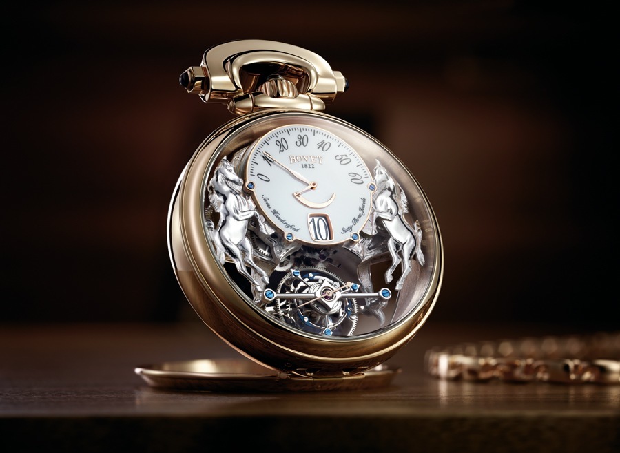 Новинка имеет круглый полированный корпус, изготовленный из 18-каратного розового или из 18-каратного белого золота, диаметром 45,00 мм, толщиной 16,45 мм, водонепроницаемый до 30 метров, конструктивно выполненный в форме AMADEO®Convertible (позволяющей трансформировать модель либо в наручные часы, либо в настольные часы, либо в карманные часы). Заводная головка, с синим сапфировым кабошоном, расположена на 12 часах. Сапфировое стекло установлено на лицевой стороне корпуса и на его задней крышке. Циферблат, как таковой, отсутствует; на 12 часах имеется децентрализованный двусторонний циферблат с эмалевым покрытием белого цвета. Модель оснащена мануфактурным швейцарским механизмом с ручным заводом Dimier 16BM02AI-HSMR, состоящим из 439 деталей, на 65 камнях, с балансовой частотой 21600 полуколебаний в час (3 гц), пятидневным запасом хода, функциями индикации часов, минут (посредством соответствующих золотых или вороненых центральных стрелок на децентрализованном циферблате с золотыми накладными римскими цифрами; а также, посредством цифрового часового указателя в апертуре, расположенной на 6 часах, и ретроградной минутной стрелки - на обратной стороне децентрализованного циферблата над задней стороной калибра), на последнем имеется, также, аналоговый указатель запаса хода. Секундная стрелка находится на круглой каретке минутного турбийона, расположенного на 6 часах. С двух сторон циферблата установлены трехмерные изображения слонов, или лошадей, или ангелов, или голубей. Поставляется на коричневом или на черном ремешке из кожи аллигатора с застежкой из 18-каратного розового или 18-каратного белого золота, а также с соответствующей золотой цепочкой. Лимитированный выпуск по 20 экземпляров каждой из двух версий модели. Цена версии в розовом золоте составляет 305000 евро, а в белом золоте - 320000 евро. Вложение 1081147Вложение 1081148 Источник: http://www.watchtime.net/nachrichten...r-virtuoso-iv/ |