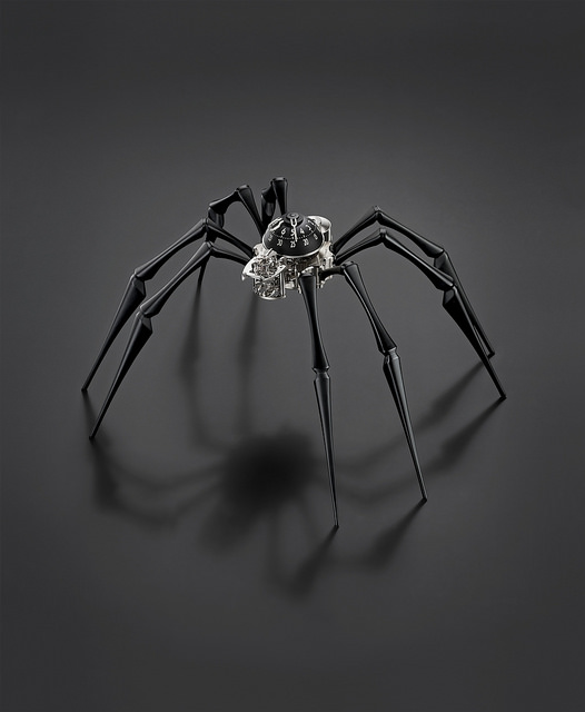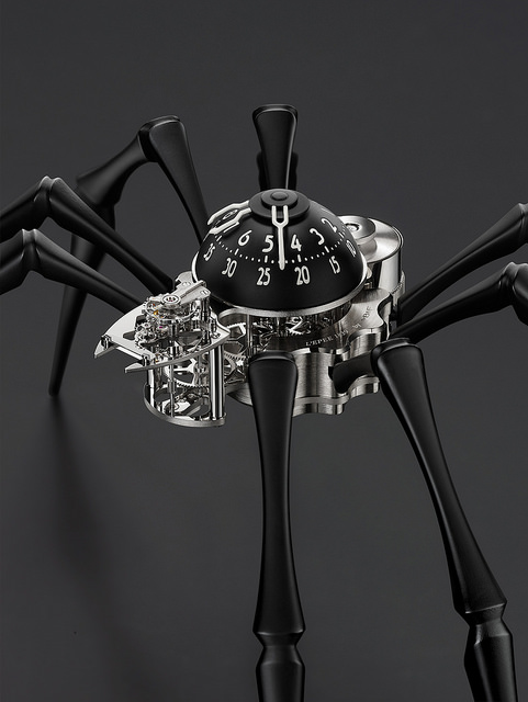 Модель Arachnophobia насчитывает целых 218 деталей, каждая из которых (за исключением камней) изготовлена и декорирована в швейцарском производственном центре L’Epée. Непростой задачей было создание ног паука в идеальном соответствии с оригинальным дизайном MB&F. Перед специалистами L’Epée была поставлена задача изготовить ноги с сочленениями, максимально похожие на настоящие. Кроме того, ноги должны иметь ручную отделку согласно стандартам Высокого часового искусства. Для этого было применено новаторское решение: детали изготовлены методом литья под давлением, что позволило получить компоненты с точно заданной геометрией. Материал (в данном случае металл) расплавляют и под давлением заливают в специальную форму. После застывания из формы извлекают готовую деталь. Такой метод часто применяют для изготовления деталей из пластика, однако его редко используют с металлами.