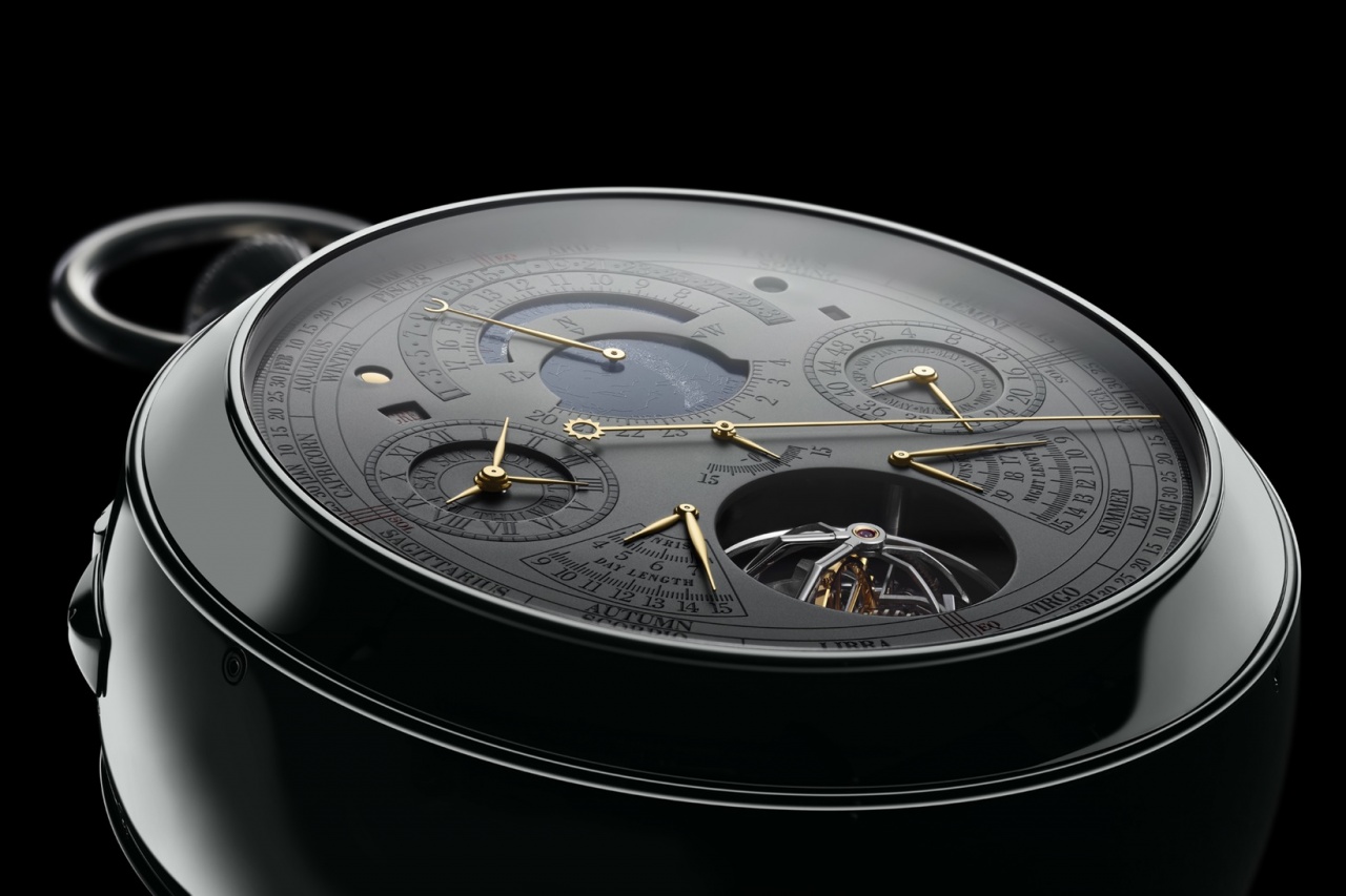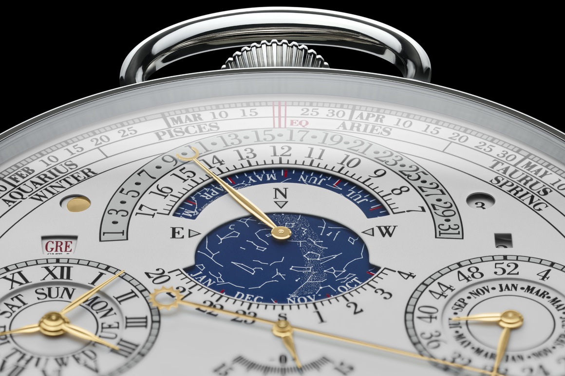 Полированный корпус новинки, изготовленный из 18-каратного белого золота, диаметром 98,00 мм, толщиной 50,55 мм. Общий вес часов (с корпусом и калибром) составляет 960 г. Вес мануфактурного швейцарского механизма - 597 г, его диаметр - 71,0 мм, толщина - 36,0 мм, он состоит из 2800 деталей, на 242 камнях. На циферблате, расположенном на передней стороне часового корпуса имеется 19 стрелок, на циферблате, расположенном на задней стороне часового корпуса - 12 стрелок. Модель имеет рекордное число часовых усложнений - 57: Шесть функций измерения времени 1. Часы, минуты, секунды, среднее солнечное время (регулятор) 2. Трехосевой турбийон 3. Регулятор-турбийон с цилиндрической спиралью 4. Индикация времени второго часового пояса в 12-часовом формате с указанием часов и минут 5. Индикация времени в 24 городах, расположенных в разных часовых поясах 6. Индикатор дня и ночи для часового пояса с индикацией времени в 12-часовом формате Семь функций вечного календаря 7. Вечный григорианский календарь 8. Название дня недели григорианского календаря 9. Название месяца григорианского календаря 10. Ретроградная индикация даты григорианского календаря 11. Индикатор високосных лет и 4-летнего цикла 12. Номер дня недели (календарь ISO 8601) 13. Номер недели (календарь ISO 8601) Восемь функций еврейского календаря 14. Вечный еврейский календарь и 19-летний цикл 15. Номер дня недели еврейского календаря 16. Название месяца еврейского календаря 17. Дата еврейского календаря 18. Столетний еврейский календарь 19. Век, десятилетие и год еврейского календаря 20. Продолжительность года в еврейском календаре (12 или 13 месяцев) 21. Цикл Метона (19 лет) Девять функций астрономического календаря 22. Индикация времен года, равноденствий, солнцестояний и знаков зодиака с помощью стрелки с изображением солнца 23. Карта звездного неба (для города, в котором проживает владелец часов) 24. Индикация часов звездного времени 25. Индикация минут звездного времени 26. Уравнение времени 27. Время восхода Солнца (для города, в котором проживает владелец часов) 28. Время захода Солнца (для города, в котором проживает владелец часов) 29. Продолжительность дня (для города, в котором проживает владелец часов) 30. Продолжительность ночи (для города, в котором проживает владелец часов) Одна функция лунного календаря 31. Фазы и возраст Луны (коррекция каждые 1027 лет) Одна функция религиозного календаря 32. Дата Дня искупления Четыре функции хронографа с тремя колонными колесами 33. Хронограф с ретроградной индикацией секунд (1 колонное колесо) 34. Сплит-хронограф с ретроградной индикацией (1 колонное колесо) 35. Счетчик часов (1 колонное колесо) 36. Счетчик минут Семь функций будильника 37. Будильник с собственным гонгом и постепенно нарастающим сигналом 38. Индикатор отключения / включения звука будильника 39. Индикатор сигнала будильника: обычный сигнал / бой 40. Механизм сигнала будильника, соединенный с системой боя 41. Индикатор режима боя будильника: большой бой или малый бой 42. Индикатор запаса хода будильника 43. Система блокировки механизма боя по окончании завода пружины будильника Восемь функций Вестминстерского боя 44. Вестминстерский бой с 5 гонгами 45. Большой бой 46. Малый бой 47. Минутный репетир 48. Ночной режим боя (с 22:00 до 08:00) 49. Система блокировки механизма боя по окончании завода пружины 50. Индикатор большого / малого боя 51. Индикатор режима боя (от