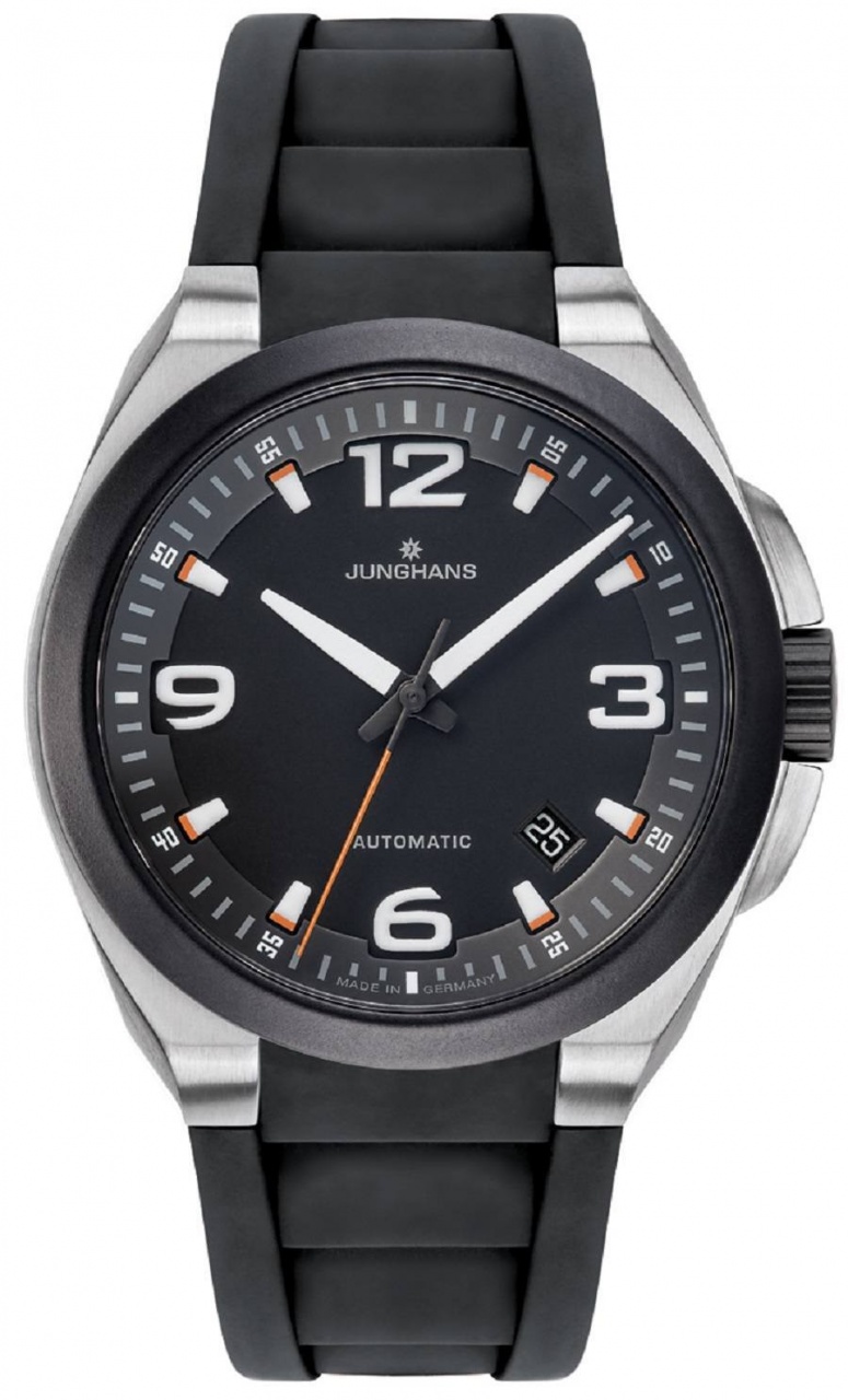 Корпус новинки, изготовленный из нержавеющей стали, диаметром 41,6 мм, водонепроницаемый до 100 метров. Фиксированный круглый безель и заводная головка выполнены из черной керамики. Последняя рифленая завинчивающаяся защищенная, с гравированным изображением эмблемы бренда Junghans на ее торце. Сапфировое стекло защищает матово-черный циферблат с арабскими цифрами, накладными часовыми индексами, покрытыми, как и часовая и минутная стрелки, люминесцентным составом белого цвета. Модель оснащена автоматическим механизмом Junghans J830, который был создан в сотрудничестве с японской компанией Seiko Instruments, с функциями индикации часов, минут, секунд (посредством соответствующих центральных стрелок) и даты (посредством соответствующего цифрового указателя в прямоугольной апертуре, расположенной между 4 и 5 часами). Цена модели Junghans Spektrum Automatic на каучуковом ремешке (черного или оранжевого цвета) составляет 1290 евро, а на браслете из нержавеющей стали с центральным рядом из черной керамики - 1390 евро. Вложение 1139498Вложение 1139499 Источник: http://www.watchtime.net/nachrichten...rum-automatic/ |
