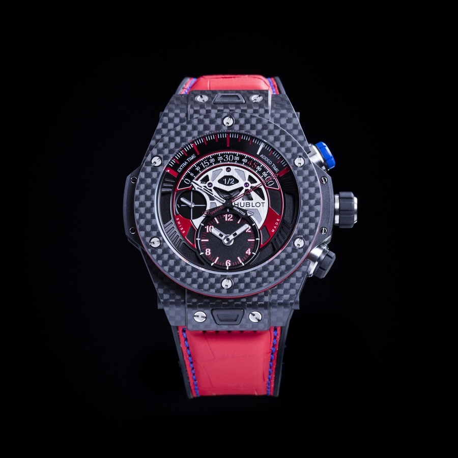 Корпус новинки выполнен в фирменной форме "Big Bang Unico", изготовленный из углеродного волокна (карбоновый), диаметром 45,5 мм, водонепроницаемый до 100 метров. На торце завинчивающейся заводной головки из сатинированного титана с черной резиновой вставкой, расположенной на 3 часах, выгравирован логотип бренда Hublot. Титановые пушеры хронографа, с синей и с черной резиновыми вставками, размещены на 2 и на 4 часах. Фиксированный круглый карбоновый безель на шести титановых винтах. Сапфировое стекло установлено на передней стороне часового корпуса (с антибликовым покрытием) и на его завинчивающейся задней крышке (с внутренним антибликовым покрытием и с напечатанной эмблемой футбольного клуба "Бавария" Мюнхен. Циферблат черный многоуровневый. Модель оснащена мануфактурным швейцарским автоматическим механизмом Hublot HUB1261 UNICO, состоящим из 385 деталей, с 72-часовым запасом хода, функциями индикации часов, минут (посредством соответствующих стрелок, покрытых люминесцентным составом белого цвета, на малом боковом циферблате, расположенном на 6 часах), секунд (на соответствующем малом боковом циферблате, расположенном на 9 часах), а также с центральным хронографом с колонным колесом (посредством ретроградных красной секундной и белой минутной стрелок, на шкале секторной формы, расположенных в верхней части циферблата). Использование хронографа во время футбольного матча осуществляется следующим образом: 1. Ретроградные стрелки хронографа запускаются в начале игры с помощью пушера, расположенного на 2 часах. При этом в центральной апертуре появляется цифра "1". 2. При завершении первого тайма и наступлении перерыва, снова нажимается пушер на 2 часах, что останавливает хронограф. При этом в центральной апертуре появляется цифра "1/2". 3. Нажатие на пушер, расположенный на 4 часах, обнуляет хронограф. 4. В начале второго тайма хронограф вновь запускается посредством нажатия на пушер, расположенный на 2 часах. При этом в центральной апертуре появляется цифра "2". 5. При завершении второго тайма, хронограф останавливается нажатием на пушер, расположенный на 2 часах. При этом в центральной апертуре появляется надпись "End". 4. Обнуление хронографа производится нажатием на пушер, расположенный на 4 часах. 6. Отсчет дополнительного времени (в случае его назначения судьей) производится на 15-минутной шкале, отмеченной надписью "Extra Time". После завершения первого 15-минутного тайма, снова запускается отчет второго тайма. Поставляется с черным каучуковым ремешком и с красным ремешком из кожи аллигатора с синей прошивкой с раскладной застежкой из титана с черным PVD-покрытием. Лимитированный выпуск 100 экземпляров. Цена модели составляет 26900 евро. Вложение 1191927 Источник: http://www.watchtime.net/nachrichten...fc-bayern-uhr/ |