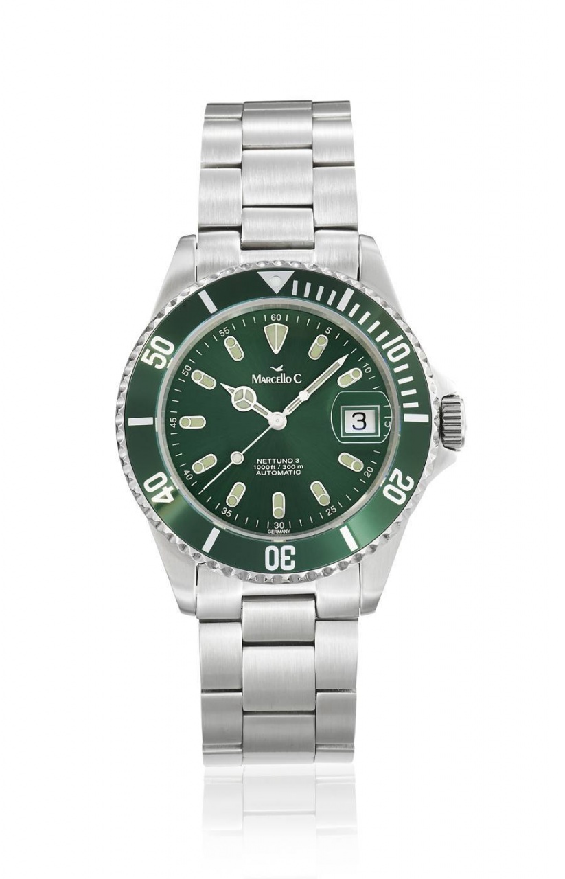 Новинка имеет круглый сатинированный корпус, изготовленный из нержавеющей стали, диаметром 40,0 мм, водонепроницаемый до 300 метров. Вращающийся однонаправленный дайверский безель на 120 щелчках, с зеленым или синим покрытием, выполненным из алюминия. На торце защищенной завинчивающейся рифленой заводной головки, расположенной на 3 часах, выгравирована эмблема бренда Marcello C. Сапфировое стекло с лупой на 3 часах (над апертурой с указателем даты) защищает зеленый или синий циферблат с накладными часовыми индексами и стрелками, покрытыми люминесцентным составом светло-зеленого цвета.