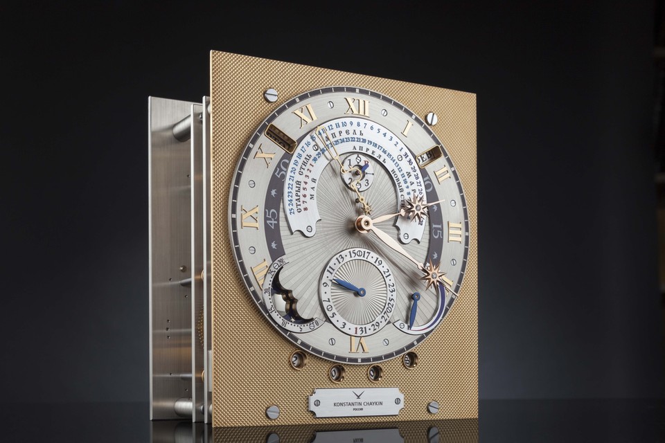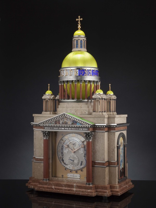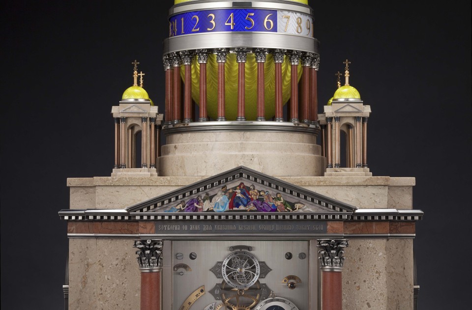 Чтобы понять всю сложность этого механизма, нужно хотя бы раз попытаться вычислить дату православной Пасхи самостоятельно. Не каждому это удастся, даже при наличии желания и терпения. Круг Луне, круг Солнцу, индикт, епакта, основание, вруцелето года, ключ границ, великий индиктион, пасхальная граница, зрячая пасхалия - вот основные методы, используемые при вычислении даты Пасхи. Эти вычисления Константин Чайкин не только освоил сам, но создал свой способ расчета и «обучил» ему механизм своих часов. Внешне часы являются воплощением образа Исаакиевского собора - одного из красивейших символов Санкт-Петербурга, родного города Константина Чайкина. Отсылкой к «северной столице» звучит и название часов – «Северная Пасхалия». Часы по замыслу перекликаются с шедевром мастера от 2007 года – сложнейшими астрономическими часами «Воскресение». Все так же механизм, вычисляющий ежегодно меняющуюся дату православной Пасхи, заключен в корпус в форме православного храма, однако и внешнее, и внутреннее содержание часов стали сложнее и изысканнее. Механика и архитектура часов «Северная Пасхалия» конкурируют друг с другом своей сложностью. В облике часов воспроизведены основные элементы собора, что позволило сделать образ узнаваемым даже для тех, кто знает «северную столицу» лишь по фотографиям. От архитектуры Исаакиевского собора заимствованы: общая композиция, воплощённая в форме корпуса часов, купол, элементы колоннады, фронтоны, фонарь, звонницы и общая цветовая гамма. В качестве материала для облицовки корпуса часов выбран мрамор, его цветовая композиция соответствует общей цветовой гамме оформления интерьеров собора. Подбор камней для корпуса часов выполнен с учётом их особенностей, и имеет сходство с внутренним убранством собора. Купол Исаакиевского собора, одно из самых грандиозных сооружений в мире, с внешней стороны покрыт листами золочёной меди. Этот зрительный образ и воплощён в часах - купол корпуса часов выполнен в технике гильоше и покрыт горячей эмалью «под золото». По замыслу мастера, корпус часов должен выражать идею Пасхи и символику праздника: купол продолжен таким образом, чтобы было образовано пасхальное яйцо. Ведь яйцо в православной традиции трактуется как символ Воскресения, и дарить крашенные яйца на Пасху – древний обычай, которому мы следуем до сих пор. Фонарь часов, как и фонарь соборного купола – венец композиции и один из основных декоративных элементов, придающей этому огромному сооружению воздушность и красоту. Элегантная же несоразмерность звонниц и купола подчеркивает величие массивного центрального барабана собора. По аналогии с оригиналом, четыре звонницы часов «Северная Пасхалия» искусно обрамляют центральный купол. Колоннада Исаакиевского собора, грандиозное сооружение, во многом является самостоятельной достопримечательностью Петербурга. Колоннада часов также выполнена из 24-х колонн, и в то же время является 24-х часовым индикатором функции «Время России», которая отображает текущее время во всех российских часовых поясах. Фасады собора украшают портики, поддерживаемые монолитными колоннами, выполненными из гранита. Благодаря им собор нес идею вечности и монументальности, воплощая её в камне. Идею переняли и часы: в механизме (вечный календарь и вечный указатель даты православной 