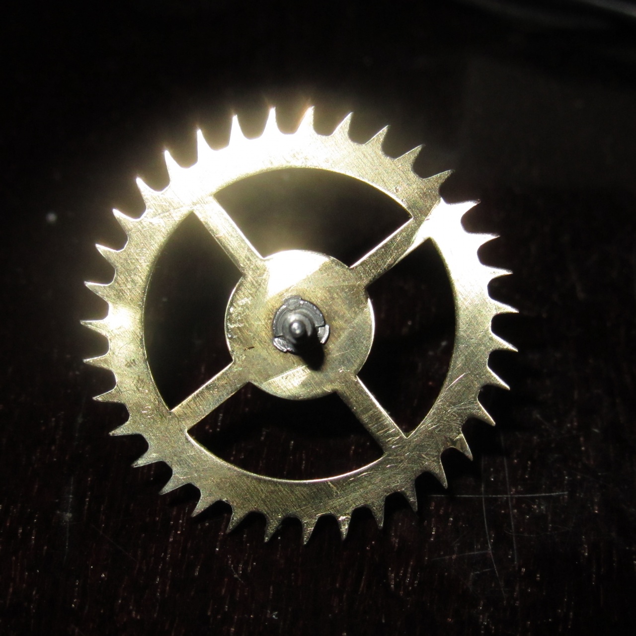На этих часах восстанавливал два зуба ходового колеса. Один был сломан, а второй загнут. Причем оба зуба рядом.