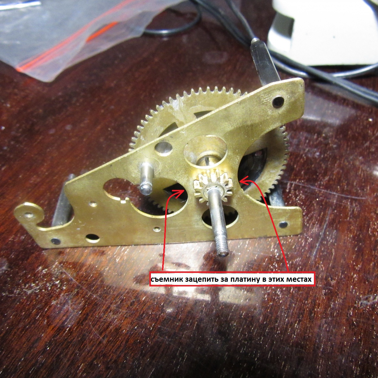 Подобрать подходящие подкладки под платину, чтобы можно было их подвинуть как можно ближе к валу. Затем через проставку из меди или алюминия выбить вал из минутного триба. Обратно триб насадить с помощью трубочки.