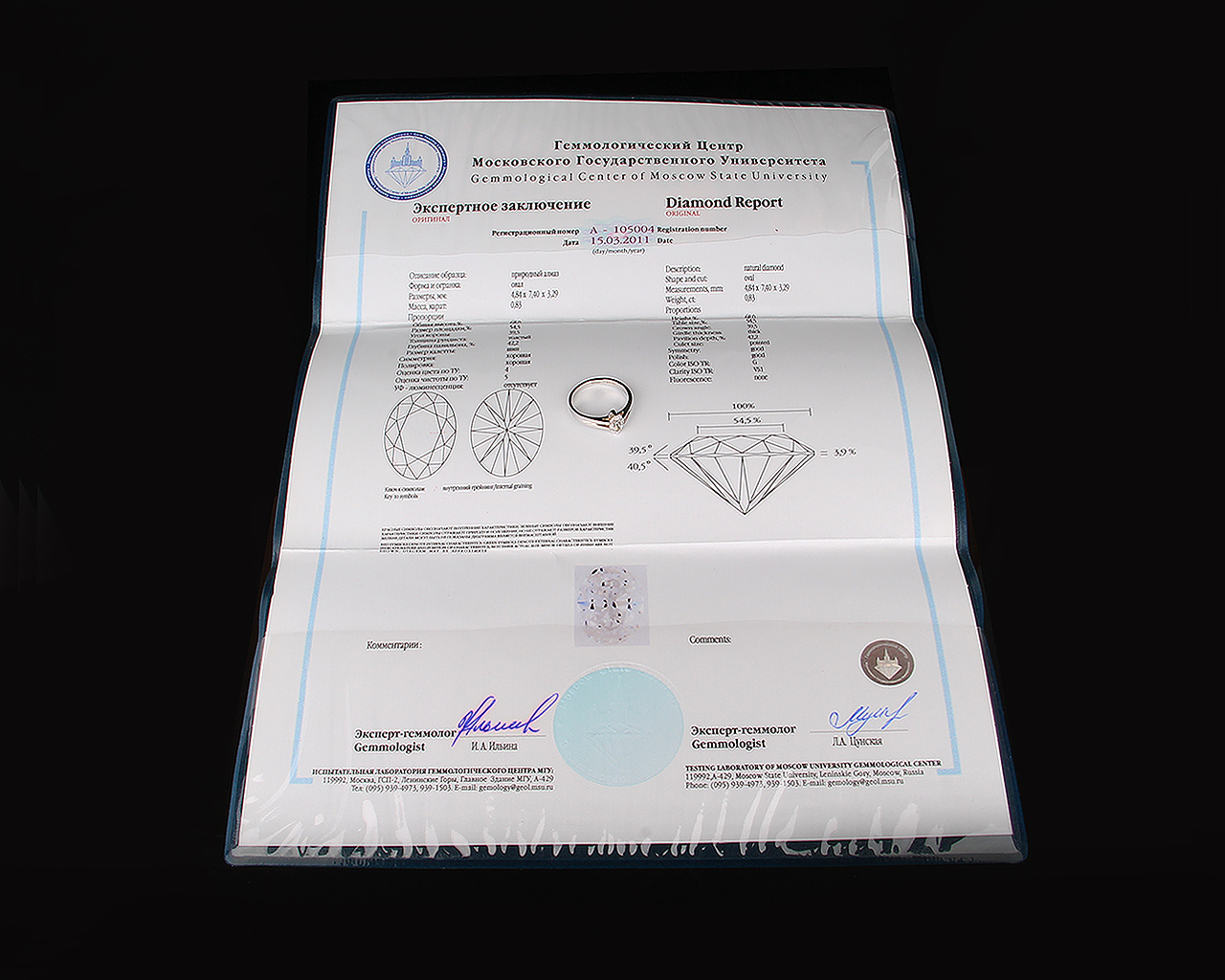 Кольцо с роскошным Бриллиантом 0.83ct. Сертификат