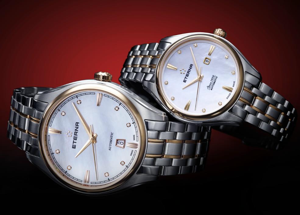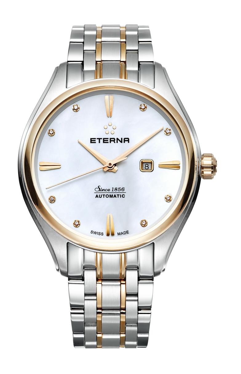 Первый из них имеет круглый полированный корпус, изготовленный из нержавеющей стали, частично с PVD-покрытием 18-каратным розовым золотом, диаметром 42 мм, водонепроницаемый до 200 метров. На торце завинчивающейся рифленой заводной головки, расположенной на 3 часах, выгравировано изображение пентаграммы из шариков от шарикоподшипника - эмблема бренда Eterna. На передней стороне часового корпуса установлено сапфировое стекло, а на его завинчивающейся задней крышке - минеральное. Циферблат выполнен из белого перламутра с накладными часовыми индексами в виде четырех продолговатых сдвоенных позолоченных маркеров и восьми бриллиантов (общим весом 0,072 карата). Часовая и минутная стрелки выполнены в стиле dauphine. Модель оснащена швейцарским автоматическим механизмом Sellita SW200-1, на 26 камнях, с балансовой частотой 28800 полуколебаний в час (4 гц), 38-часовым запасом хода, функциями индикации часов, минут, секунд (посредством соответствующих центральных стрелок) и даты (посредством соответствующего цифрового указателя в апертуре, расположенной на 6 часах). Поставляется на браслете из нержавеющей стали с частично с PVD-покрытием 18-каратным розовым золотом и с раскладной застежкой. MSRP этого варианта модели составляет 2600 швейцарских франков. Меньший вариант модели отличается 34-миллиметровым диаметром корпуса, меньшим весом бриллиантов на циферблате (0,04 карата). Она оснащена швейцарским автоматическим механизмом ETA 2671, на 25 камнях, с балансовой частотой 28800 полуколебаний в час (4 гц), 40-часовым запасом хода, функциями индикации часов, минут, секунд (посредством соответствующих центральных стрелок) и даты (посредством соответствующего цифрового указателя в апертуре, расположенной на 3 часах). MSRP этого варианта модели составляет 1990 швейцарских франков. Вложение 1257518Вложение 1257519 Источник: http://forums.timezone.com/index.php...=0#msg_7179626 |