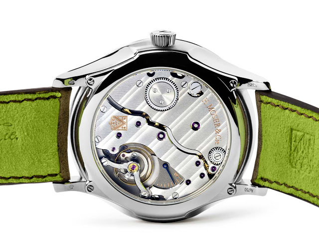 Круглый полированный корпус новинки, изготовленный из 18-каратного белого золота, диаметром 43,0 мм, толщиной 12,6 мм. На торце завинчивающейся рифленой заводной головке, расположенной на 3 часах, выгравирован логотип бренда H. Moser & Cie. Сапфировое стекло установлено на передней стороне часового корпуса (выпуклое) и на его завинчивающейся задней крышке. Циферблат fumé небесно-голубого цвета с лучистой отделкой, с продолговатыми гранеными часовыми индексами и стрелками (в том числе, часовая и минутная - выполненные в листьевидной форме). Модель оснащена мануфактурным швейцарским механизмом с ручным заводом H. Moser & Cie. HMC 327, на 29 камнях, с балансовой частотой 18000 полуколебаний в час (2,5 гц), трехдневным запасом хода, функциями индикации часов, минут (посредством соответствующих центральных стрелок), секунд (на соответствующем малом боковом циферблате, расположенном на 6 часах) и запаса хода (посредством соответствующего аналогового указателя, расположенного на задней стороне калибра и просматриваемого через стекло на задней крышке часового корпуса). Механизм отменно отделан и декорирован. Поставляется на бежевом кожаном ремешке с зеленой подкладкой и с застежкой из 18-каратного белого золота с выгравированным логотипом H. Moser & Cie. Вложение 1260597 Вложение 1260598 Вложение 1260599 Вложение 1260600 Источник: http://www.timeandwatches.com/2016/0...econds-xl.html |