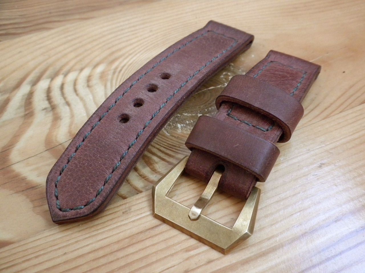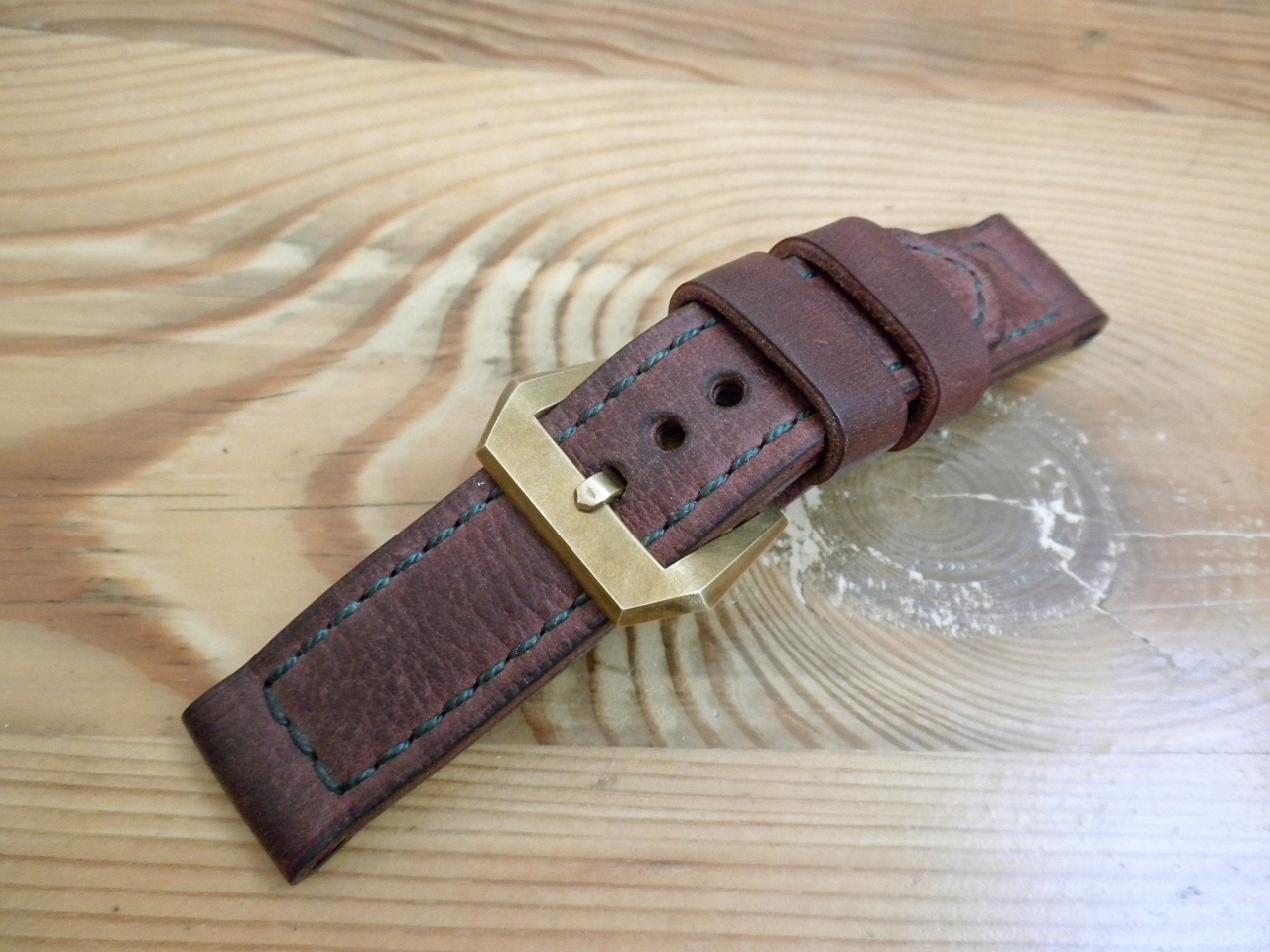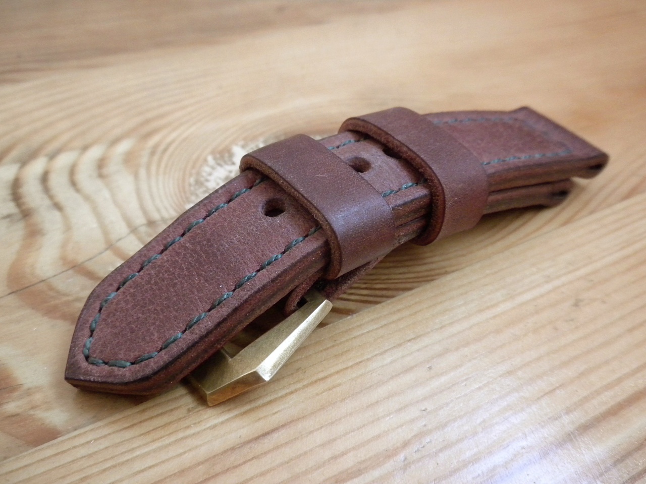 Второй ремешок винного цвета с зеленой прошивкой и латунной баклей ручной работы продан.