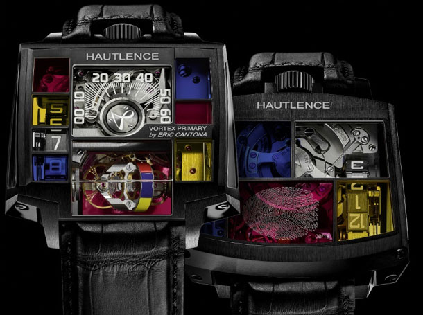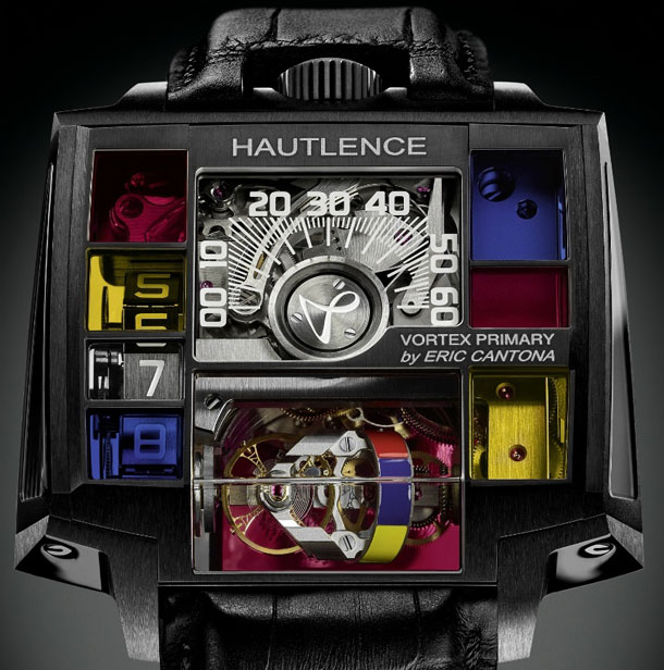 Часы Hautlence Vortex Primary - это нечто совершенно новое в мире часового искусства. Они интересные, странные и эксцентричные. Выдающийся плод сотрудничества между компанией Hautlence и французским экс-футболистом Эриком Кантоном. Элементы внешнего вида модели напоминают яркие геометрические картины Мондриана, мастера неопластицизма. Часы имеют 19 различных стеклянных панелей (сапфир, рубин и синяя шпинель), передающих стиль витража. Он прекрасно смотрится в часах и демонстрирует богатый визуальный опыт компании.