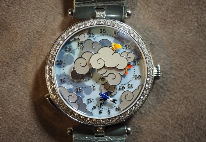 Хотя модель и создана из белого золота, а ее безель украшен блестящими бриллиантами, настоящий шик ей придает совсем другое. Новинка представляет собой один из наиболее технически прогрессивных часов выставки SIHH. Привычные часовые стрелки в аксессуаре заменены на трех крохотных бабочек и птичку.