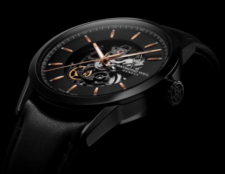 Новая модель Freelancer Skeleton от швейцарской часовой компании Raymond Weil выпущена в честь 40-летия бренда. Она имеет круглый корпус, изготовленный из нержавеющей стали с черным PVD-покрытием, с боковыми стенками из углеродного волокна, диаметром 42,5 мм, толщиной 10,3 мм, водонепроницаемый до 100 метров. На торце завинчивающейся защищенной рифленой заводной головки выгравирован логотип бренда Raymond Weil. Сапфировое стекло установлено на передней стороне часового корпуса (с двусторонним антибликовым покрытием) и на его завинчивающейся задней крышке. Циферблат матово-черного цвета с накладными продолговатыми позолоченными часовыми индексами, покрытыми, как и часовая и минутная стрелки, люминесцентным составом белого цвета. В центре имеется большое отверстие, сквозь которое отлично просматриваются детали калибра. Модель оснащена скелетонизированным швейцарским автоматическим механизмом Raymond Weil RW4215 (базовый калибр Sellita), на 26 камнях, с балансовой частотой 28800 полуколебаний в час (4 гц), 38-часовым запасом хода, функциями индикации часов, минут, секунд (посредством соответствующих центральных стрелок).